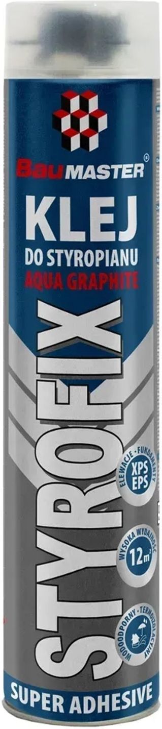 Baumaster Klej do styropianu Styrofix Aqua Graphite 750g Klej do styropianu Styrofix marki Baumaster to niskoprężny klej poliuretanowy z aplikatorem pistoletowym. Charakteryzuje się wysoką przyczepnością do płyt styropianowych w systemach ociepleń budynków, przy ociepleniu fundamentu i piwnic. Zastosowanie kleju Styrofix Klej poliuretanowy sprawdzi się podczas klejenia płyt styropianowych w systemach ociepleń budynków metodą BSO oraz płyt XPS i EPS przy ocieplaniu fundamentów i przyziemnych części budynków. Stosowany jest także do montażu parapetów, wypełniania szczelin w izolacji termicznej oraz do klejenia kasetonów styropianowych i paneli ściennych. Doskonała przyczepność Klej do styropianu posiada doskonała przyczepność do powierzchni ceramicznych, betonowych, drewnianych, PCV oraz wszelkiego rodzaju styropianów oraz tynków. Ponadto wysoka przyczepność kleju występuje również w przypadku podłoży z powłoką bitumiczną, papy i asfaltowych mas izolacyjnych. Klej po 2 godzinach od aplikacji jest wstępnie utwardzony i pozwala na kontynuację prac. Temperatura pracy i wydajność Podczas pracy z klejem poliuretanowym Styrofix temperatura podłoża i powietrza powinna wynosić od -5 do ც stopni. Natomiast temperatura puszki z klejem powinna wynosić około 20 stopni. W przypadku klejenia XPS wydajność opakowania wynosi do 12m2 powierzchni. Z kolei w przypadku klejenia BSO wynosi do 8 m2 powierzchni. Zużycie może się różnić w zależności od temperatury i wilgotności powietrza.