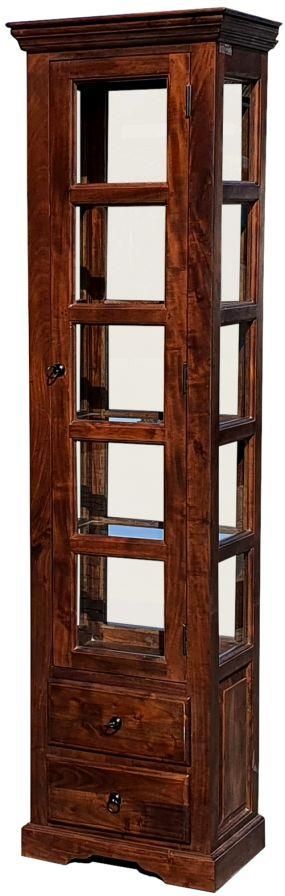 Szerokość: 53cm/Głębokość: 35cm/Wysokość: 195cm/ Kod: 99-L115AL/Wąska przeszklona witryna z litego drewna akacji indyjskiejCechy mebla: - mebel w całości wykonany z litej deski akacji indyjskiej - szklane półki - drewniane szufladki z metalowym uchwytem - mebel pokryty brązową bejca i satynowym …