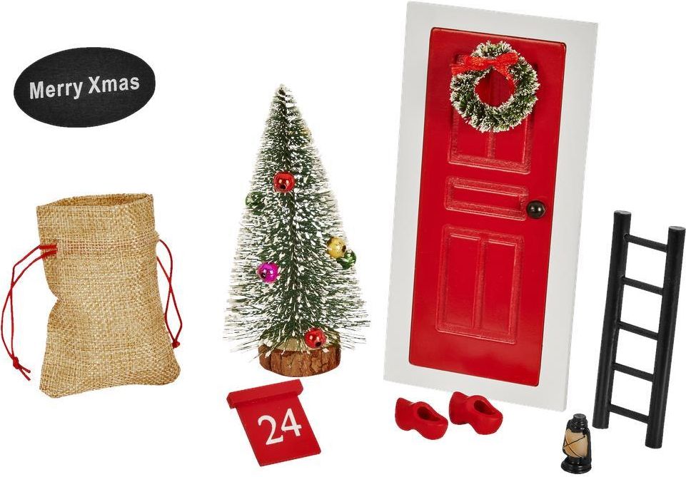 Zestaw startowy do zbudowania własnych drzwi skrzata! Drzwi (9 x 18 cm), drabina, wieniec na drzwi, wycieraczka, skrzynka na listy, worek, choinka, latarnia i para chodaków.