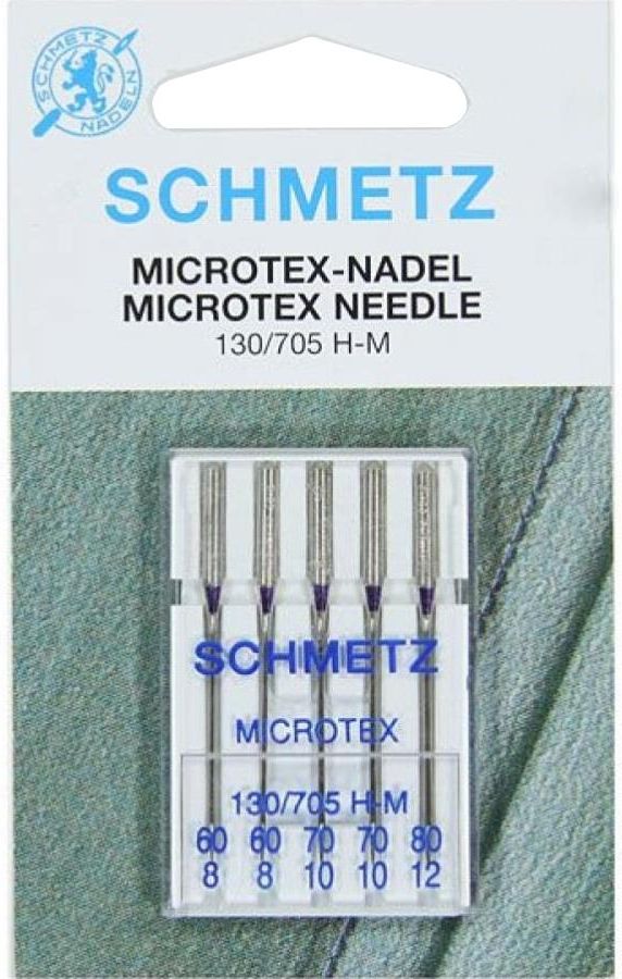 Igły do maszyn SCHMETZ Microtex w rozmiarze 60–80 to zestaw pięciu igieł przeznaczonych do precyzyjnego szycia bardzo cienkich lub gęsto tkanych materiałów, takich jak jedwab, mikrofibra, tafta czy materiały powlekane, a także do pracy z tkaninami syntetycznymi i dekoracyjnymi.