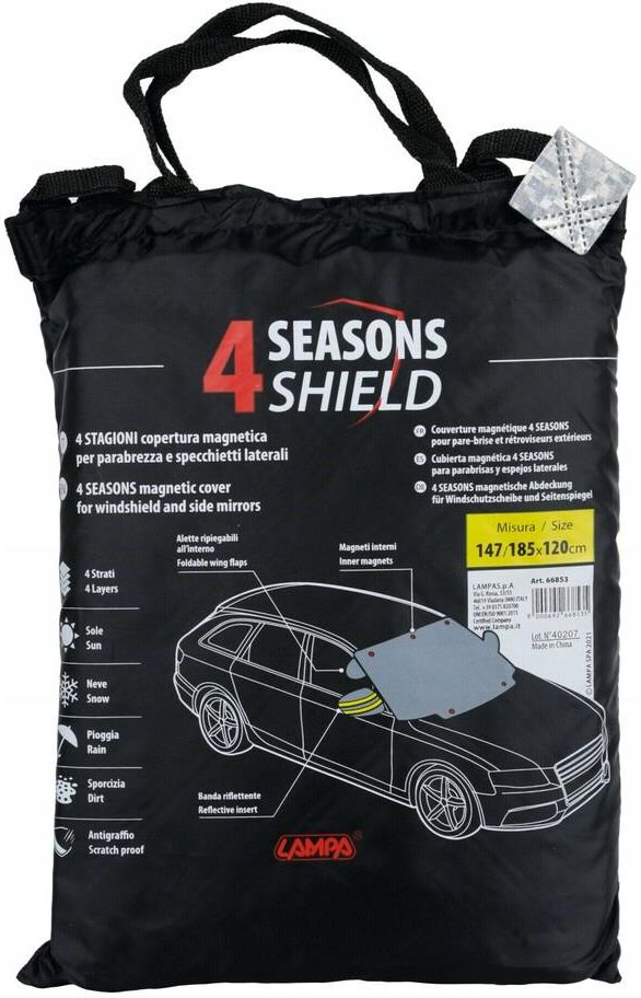 OSŁONA MATA ANTYSZRONOWA NA SZYBĘ ORAZ LUSTERKA CAŁOROCZNA z magnesami RENOMOWANEJ WŁOSKIEJ MARKI LAMPA Symbol 55648 WYSOKIEJ JAKOŚCI MATA ANTYSZRONOWA Włoskiej marki LAMPA. Bardzo solidna i trwała chroni szybę oraz lusterka. Wyposażona w megnesy, które ułatwiają montaż. Posiada wszyte odblaski, które dodatkowo zabezpieczają pojazd w nocy. Cechy Wyposażona w magnesy ułatwiające montaż. Rozmiar uniwersalny, odpowiedni dla większości samochodów. Odporny na rozdarcie, odporny na skoki temperatury i zdarzenia atmosferyczne. 4-komponentowy, wielowarstwowy: arkusz PE laminowany aluminium, bawełna spunlaced, bawełna kompozytowa i podszewka TNT. 5 magnesów o wysokiej wytrzymałości (Ø 14x2 mm, siła 1700-1800G każdy) jest umieszczonych wewnątrz tkaniny, aby uniknąć zarysowania karoserii. Może być używany przez cały rok: zimą chroni przed mrozem, śniegiem i lodem, latem chroni przed promieniami UV, kurzem, żywicami i liśćmi. Magnesy pozwalają na szybką aplikację, unikając używania wycieraczek do przedniej szyby, aby utrzymać osłonę na miejscu. W ten sposób pióra wycieraczek są również chronione przed czynnikami atmosferycznymi. Pełne osłonięcie przedniej szyby i lusterek bocznych dzięki dwóm specjalnym osłonom z wkładkami odblaskowymi, które gwarantują lepszą widoczność w nocy, gdy samochód jest zaparkowany. Dostarczany z praktyczną torbą / etui do przechowywania produktu, gdy nie jest używany Wymiary: 147/185x120 cm Cena dotyczy 1 sztuki