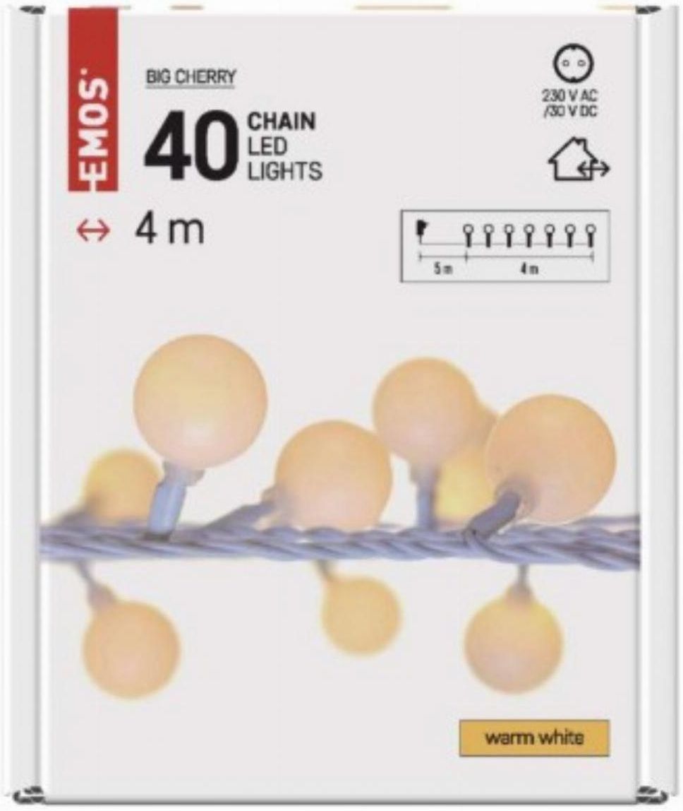 Lampki choinkowe kulki duże 40 LED 4m ciepła biel timer IP44 biały przewód Producent: EMOS PL SP. Z O Marka: EMOS PL SP. Z O Kod produktu: 1775623 EAN: 8592920096048 Parametry Produkt: łańcuch barwa światła: ciepła biel wymiary: 4 m kształt: kulka zastosowanie: zewnętrzne i wewnętrzne timer: tak pilot zdalnego sterowania: nie typ zasilania: zasilacz sieciowy ilość LED: 40 odstęp między diodami LED: 10 cm wielkość diod LED: 25 mm długość przewodu: 5 m do wysokości choinki: 100 cm kolor przewodów: biały moc: 3,6 W napięcie wejściowe: 230 V AC napięcie wyjściowe: 31 V DC możliwość podłączenia: nie stopień ochrony: IP44 materiał: PVC Na samym dole znajduje się instrukcja (PDF) FILM INFORMACYJNY: https://youtu.be/bLlf6niEQOY Łańcuchy CHERRY - z dużymi kulami Łańcuchy CHERRY - z dużymi kulami oferują szerokie zastosowanie nie tylko w tworzeniu świątecznych dekoracji i atmosfery. Ich lampki LED są zamieszczone w kulkach o średnicy 2,5 cm, które są dekoracyjne nawet wtedy, gdy łańcuch nie świeci. W oparciu o wybraną długość i kolor światła, zadbają o drobne dekoracje we wnętrzu, rozświetlą choinkę i większe drzewko w ogrodzie. Idealne do stworzenia odpowiedniej atmosfery na uroczystości rodzinnej, weselu czy imprezie dla dzieci. W każdym miejscu w ciągu dnia białe kule wyłączonego łańcucha CHERRY mogą służyć jako dekoracja, która rozświetli się po zmroku i stworzy odpowiednią atmosferę. Łańcuchy CHERRY są więc dosłownie dwoma w jednym. Pokochasz również funkcję timera, która aktywuje łańcuch: powtarzalnie świeci przez 6 godzin, a następnie wyłącza się przez 18 godzin. Łańcuchy CHERRY są odporne na wilgoć dzięki ochronie IP44 i odpowiednie dla wszystkich dekoracji wewnętrznych i zewnętrznych. Stwórz odpowiednią atmosferę! Do oświetlenia nie tylko choinki oferujemy plejadę łańcuchów LED pod marką EMOS, które wyróżniają się niskim poborem prądu i długą żywotnością. Do wyboru są sznury zasilane tylko wewnątrz (IP20), tylko na zewnątrz (IP44) lub zasilane bateriami, które są idealne do dekorowania miejsc bez dostępu do gniazdka elektrycznego. Dostępne są cztery gamy łańcuchów świetlnych LED, różniące się wielkością i kształtem diod LED - NANO - CLASSIC - CHERRY - TRADYCYJNY. Decydującymi kryteriami przy wyborze odpowiedniego łańcucha są jego długość, ilość diod LED oraz barwa światła. Prezentowane zdjęcia i rysunki mają charakter poglądowy, mogą różnić się od prezentowanych na aukcji. Aukcja dotyczy pojedynczej sztuki, chyba, że inaczej wskazuje tytuł naszej aukcji - nie mylić z produktyzacją allegro.