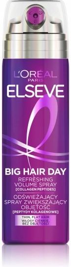 Loreal Elseve Big Hair Day Odświeżający Spray Zwiększający Objętość Włosów 200ml Loreal Elseve Big Hair Day Odświeżający Spray Zwiększający Objętość Włosów to szybkie rozwiązanie dla cienkich włosów pozbawionych objętości. Unosi włosy u nasady już w kilka sekund, przywracając fryzurze świeżość i lekkość bez konieczności mycia. Spray zwiększa objętość u nasady nawet o 0,4 cm już po 3 sekundach, a włosy wyglądają na oczyszczone nawet do 48 godzin. Formuła została wzbogacona o peptydy kolagenowe, które poprawiają sztywność włókien włosów, wspierając efekt uniesienia i sprężystości bez obciążania. Produkt posiada potrójny dozownik, który ułatwia precyzyjną aplikację bezpośrednio u nasady. Spray idealnie sprawdzi się w ciągu dnia - przed wyjściem, po pracy lub zawsze wtedy, gdy fryzura potrzebuje natychmiastowego odświeżenia i widocznej objętości. Korzyści ze stosowania - Natychmiastowe uniesienie włosów u nasady - Zwiększenie objętości bez efektu obciążenia - Efekt oczyszczonych włosów nawet do 48 godzin - Potrójny dozownik ułatwiający aplikację - Formuła z peptydami kolagenowymi poprawiającymi sztywność włókien Sposób użycia Stosuj w dowolnym momencie na suchych włosach. Wstrząśnij przed użyciem. Spryskaj włosy u nasady z odległości około 15 cm i delikatnie wmasuj palcami. Aby wzmocnić efekt objętości, odwróć głowę do dołu i spryskaj ponownie u nasady włosów. Ostrzeżenia Niebezpieczeństwo: skrajnie łatwopalny aerozol. Pojemnik pod ciśnieniem - ogrzanie grozi wybuchem. Przechowywać z dala od źródeł ciepła, gorących powierzchni, źródeł iskrzenia, otwartego ognia i innych źródeł zapłonu. Nie palić. Nie rozpylać nad otwartym ogniem lub innym źródłem zapłonu. Nie przekłuwać ani nie spalać, nawet po zużyciu. Chronić przed światłem słonecznym. Nie wystawiać na działanie temperatury przekraczającej 50°C. Chronić przed dziećmi. Nie rozpylać w kierunku oczu ani na podrażnioną skórę. Nie wdychać. Nie stosować do innych celów niż te, do których produkt jest przeznaczony. Stosować w dobrze wentylowanych pomieszczeniach. Pojemność: 200ml