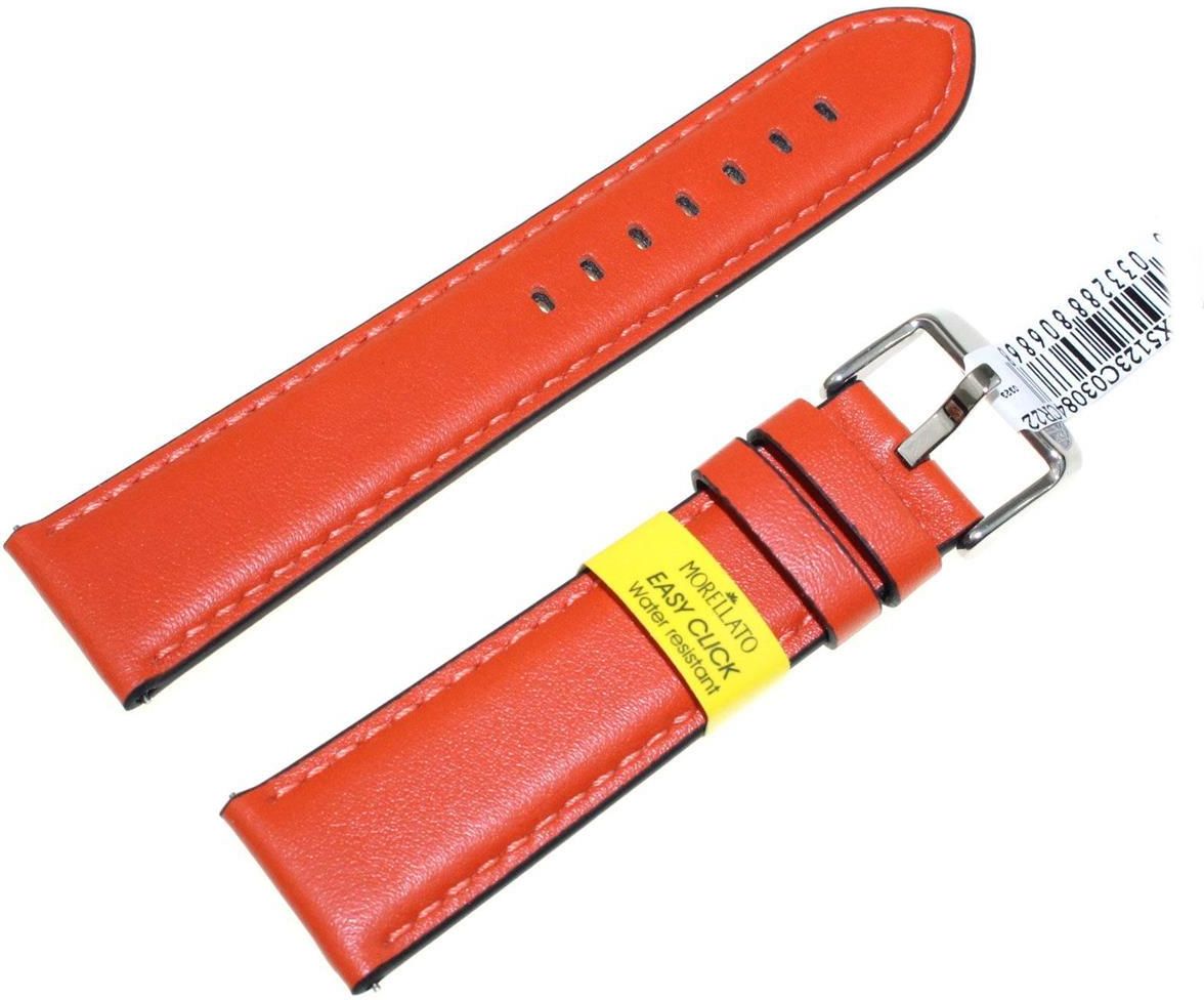 Pomarańczowy skórzany zwężany matowy gładki wodoodporny pasek do zegarka MORELLATO Croquet Easy Click. Szerokość 22 mm. Antyalergiczna sprzączka. Pasek pasuje do wszystkich zegarków ze standardowym mocowaniem o szerokości 22 mm. Teleskopy w zestawie