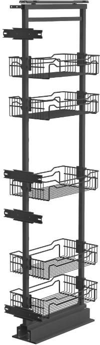 Kosz Cargo Maxi, 300 mm, 5 półki, pełny wysuw, cichy domyk, antracyt Czas realizacji zamówienia +/- 7 dni roboczych Kosz cargo maxi to świetne i nowoczesne rozwiązanie aby w niezwykle funkcjonalny sposób zagospodarować miejsce wewnątrz zabudowy meblowej. 5 półek i udźwig całkowity wynoszący aż 120 kg pozwala na swobodne umieszczanie w nim nawet ciężkich przedmiotów. Nowe, gustowne pokrycie w kolorze antracytu - P68 - doda Państwa meblom elegancji i sprawi, że wyróżnią się one na tle innych systemów koszy. Cechy Wysokość: minimalna: 1710 mm maksymalna: 1910 mm 5 półki pełny wysuw kosza funkcja cichego domyku uniwersalna konstrukcja umożliwiająca stosowanie koszy i półek miękki domyk optymalna organizacja przestrzeni szafki swobodny dostęp do półek jednocześnie z obydwu stron maks. obciążenie półki 15kg