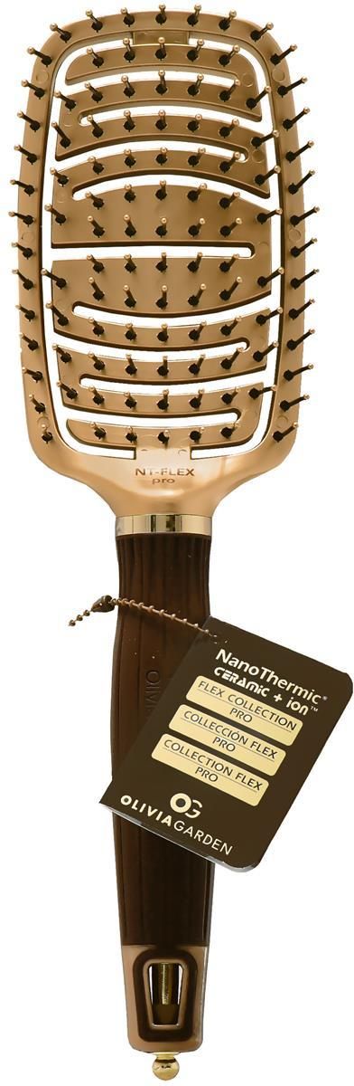 Olivia Garden 93 NanoThermic Flex Pro 752110716967 Olivia Garden 93 NanoThermic Flex Pro to profesjonalna szczotka do stylizacji, która łączy innowacyjne technologie, aby ułatwić codzienną pielęgnację włosów. Wyposażona w jonowe włosie, które minimalizuje puszenie i zapobiega elektryzowaniu, pozwala uzyskać gładkie i lśniące wykończenie. Technologia NanoThermic Flex zapewnia równomierne rozprowadzanie ciepła i przyspiesza proces suszenia, co czyni stylizację bardziej efektywną. Model NT-FLEXPRO jest idealny do rozczesywania i układania włosów podczas suszenia na ciepło. Ergonomiczny kształt szczotki i elastyczna konstrukcja sprawiają, że praca z nią jest wygodna i precyzyjna, niezależnie od typu włosów. To narzędzie doskonałe zarówno dla profesjonalistów, jak i osób stylizujących włosy w domowym zaciszu. OL93