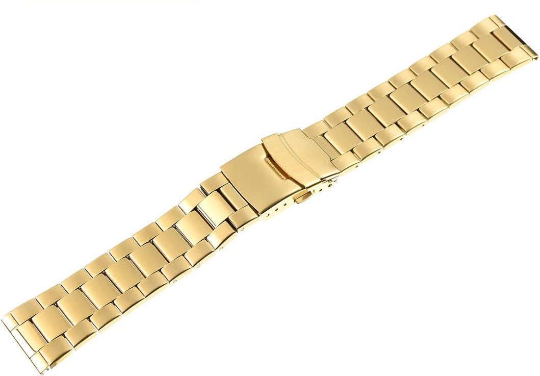 Stalowa złota błyszcząca zwężana bransoleta do zegarka o szerokość 24 mm. Pasuje do wszystkich zegarków ze standardowym mocowaniem o szerokości 24 mm. Zapięcie z dodatkowym zabezpieczeniem. Teleskopy w zestawie