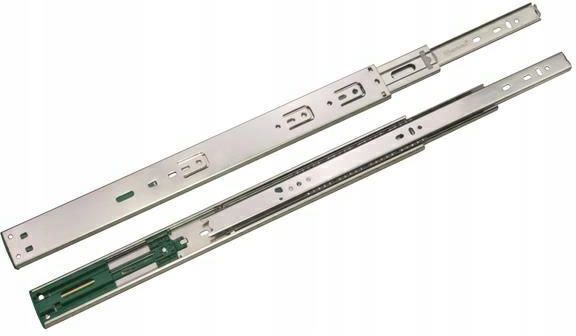 Prowadnica kulkowa pełnego wysuwu z systemem miękkiego domyku Cechy produktu: długość: 400mm mechanizm spowalniający z funkcją cichego domknięcia Łożysko kulowe Dopuszczalne obciążenie 30 kg Teleskopowa budowa prowadnika Materiał: stal Wysokość :H=45mm