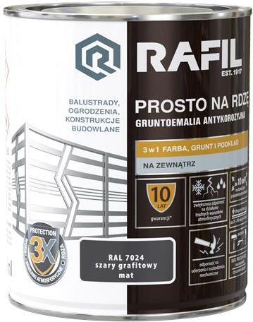 RAFIL Prosto na Rdzę Mat Pojemność: 0,75L | Kolor: RAL7024 szary grafitowy ZASTOSOWANIE Metal Barierki i balustrady Wyroby kowalstwa artystycznego Bramy i ogrodzenia Elementy ozdobne DOSTĘPNE KOLORY RAFIL PROSTO NA RDZĘ MAT RAL7024 szary grafitowy RAL9005 czarny głeboki OPIS PRODUKTU …