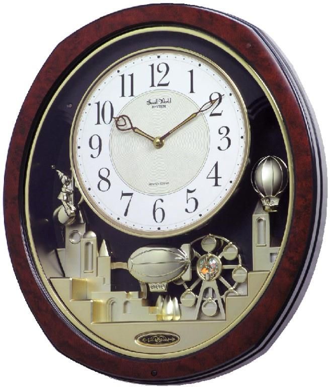 Efektowny duży 36 x 41 cm elegancki owalny zegar ścienny z melodiami RHYTHM Small World. 18 melodii, czujnik zmroku, regulacja głośności, ładny czysty dźwięk. Wahadło. Kryształki