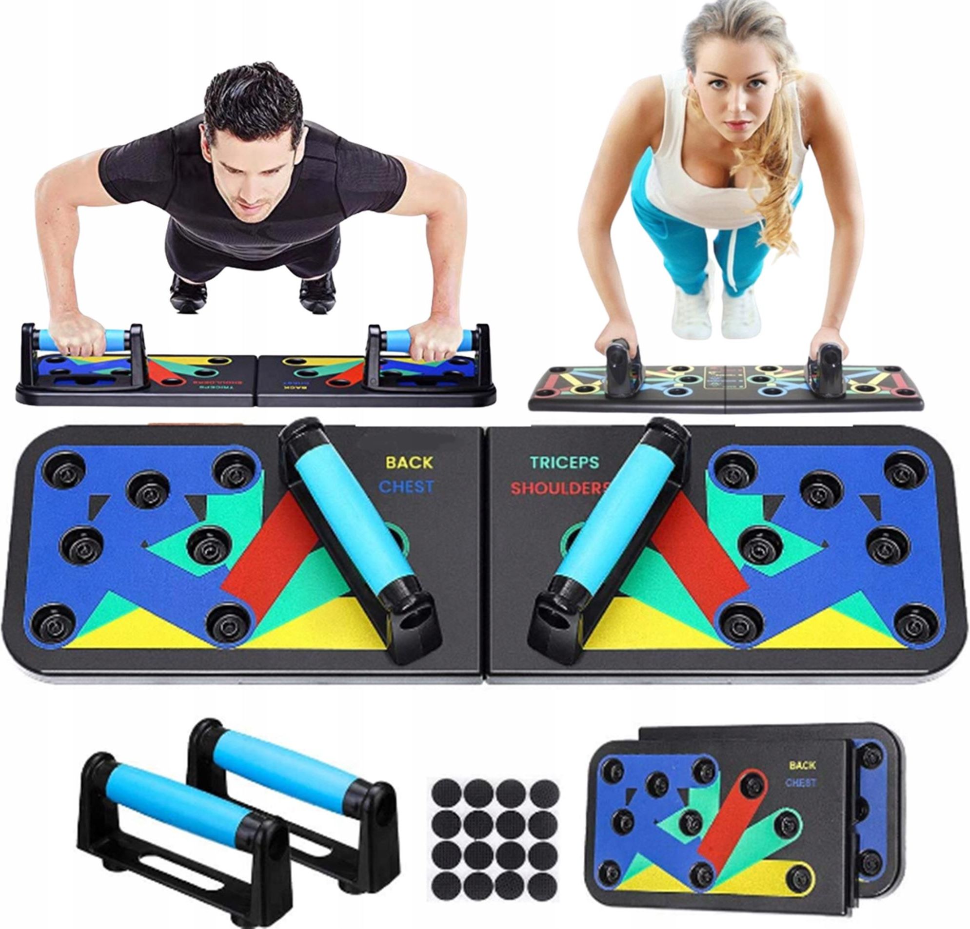 ZESTAW DESKA WIELOFUNKCYJNA z UCHWYTAMI DO POMPEK 14w1 CECHY PRODUKTU Różne ustawienia podpórek w celu ćwiczenia określonych partii mięśniowych: Niebieski - ramiona, Czerwony - klatka piersiowa, Żółty - triceps Zielony - plecy Wytrzymały system push up „Plug & Press” z wieloma pozycjami i …