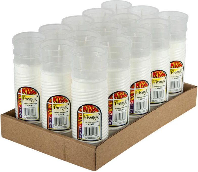 Wkład Parafinowy Promyk 3 o 64 godzinnym czasie palenia. Całoroczne wkłady sprawdzające się w różnych warunkach atmosferycznych. Cechy produktu: Czas palenia wkładu: 64 godzin Ilość w opakowaniu: 15 szt. Rozmiar: 17 cm x 5,5 cm Sezon: całoroczne Kolor: biały Waga: 170 g/szt. Dlaczego warto wybrać ten wkład? Świetne na krótkie wizyty na cmentarzu, gdy zależy Ci na symbolicznym zapaleniu znicza. Idealne dla osób, które regularnie wymieniają wkłady, np. co kilka dni. Gwarancja oszczędności bez kompromisów w jakości Łatwość transportu – wygoda w przenoszeniu, nawet w większych ilościach Praktyczne, gdy zależy Ci na szybkim upamiętnieniu bliskich bez potrzeby stosowania dużych i ciężkich wkładów, które spalają się dłużej Zasady przechowywania i ważne wskazówki: Przechowuj w miejscu suchym, chłodnym oraz osłoniętym od światła, ustawiając wkład w pozycji pionowej. Czas spalania może się różnić w zależności od warunków pogodowych. Używać na zewnątrz w odpowiednich zniczach.