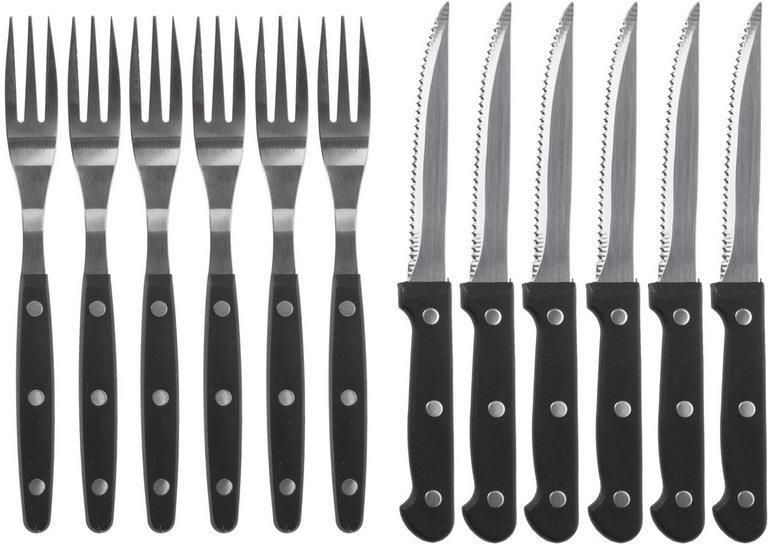 Sztućce do steków burgerów noże widelce zestaw 12 el. Zestaw sztućców składający się z 6 noży oraz 6 widelców. W zestawie: 6x widelec (długość 19 cm, długość uchwytu 10 cm, szerokość 2 cm), 6x nóż (długość 21 cm, długość uchwytu 9,5 cm, szerokość 2 cm). Świetnie sprawdzą się do krojenia potraw z grilla, burgerów, steków oraz pizzy. Noże posiadają ostrze zakończone ząbkami, więc bez problemu poradzą sobie z krojeniem każdej potrawy nawet steków. Przydatne zarówno w domu, w ogrodzie, ale również w lokalach gastronomicznych w których serwowane są burgery czy steki. SOLIDNE - Zestaw sztućców dla sześciu osób. Składający się z 6 noży oraz 6 widelców wykonanych ze stali nierdzewnej z uchwytami wykonanymi z tworzywa w kolorze czarnym. ODPOWIEDNI ROZMIAR - Ostrze noża ma długość 11,5 cm i jest wyposażone w ząbki. Widelce mają długość 19 cm. PRAKTYCZNE - Idealny zostaw do spożywania steków, pizzy, burgerów i potraw z grilla. WYGODNE - Solidne uchwyty z 3-punktowym nitowaniem ze stali. Stabilnie leżą w dłoni. UNIWERSALNE - Polecane do użytku zarówno domowego jak i lokali gastronomicznych.