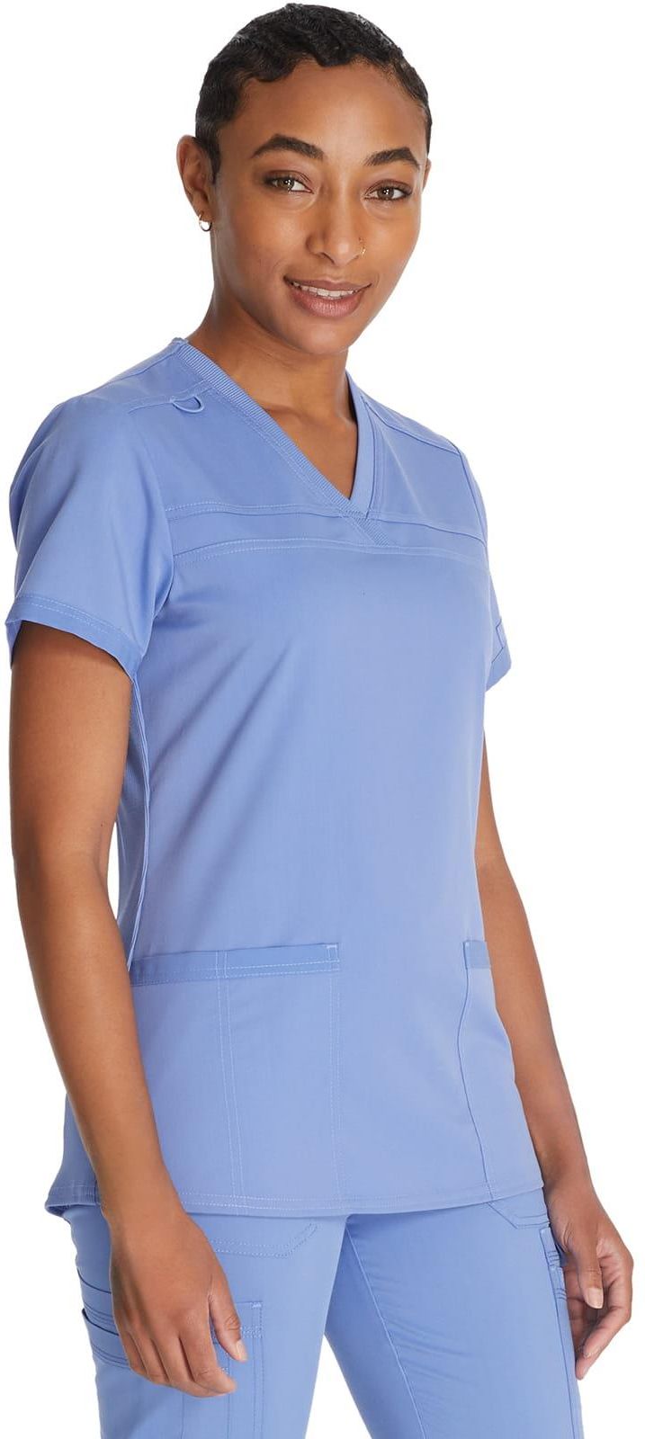 Bluza medyczna Dickies Balance DKE870 CIE Kolekcja: Dickies Balance Model: DKE870 CIE Dickies to amerykańska marka, której historia sięga 1922 roku. Początkowo specjalizowała się w produkcji wytrzymałej odzieży roboczej, przeznaczonej głównie dla pracowników fizycznych. Odzież robocza Dickies była nieodłącznym elementem wyposażenia wielu zawodów wymagających ciężkiej pracy, takich jak budownictwo, mechanika czy rolnictwo. Odzież medyczna Dickies Choć Dickies kojarzy się przede wszystkim z odzieżą roboczą, marka oferuje również specjalistyczne ubrania medyczne. Charakteryzują się one: Wysoką odpornością na zabrudzenia i środki dezynfekujące: Dzięki specjalnym impregnacjom tkaniny są łatwe w utrzymaniu czystości. Komfortem noszenia: Lekkie, przewiewne materiały i ergonomiczne kroje zapewniają wygodę podczas długiej pracy. Funkcjonalnością: Liczne kieszenie i praktyczne rozwiązania ułatwiają organizację pracy. Odzież medyczna Dickies jest więc idealnym wyborem dla osób pracujących w służbie zdrowia, które cenią sobie zarówno profesjonalny wygląd, jak i komfort noszenia. Stylowa bluzka medyczna z dekoltem w serek, posiada dzianinowy kołnierz, dwie naszywane kieszenie z przodu, panele z dzianiny prążkowanej z tyłu dla komfortu oraz lekko zaokrąglony dół. Pętelka na identyfikator dodana na prawym karczku, tonalna metka Dickies na lewym rękawie. Nowoczesny krój. Długość środka pleców: 69 cm. Krój: Nowoczesny Liczba kieszeni: 2 kieszenie Rodzaje kieszeni: Kieszenie naszywane Cechy: Detale z dzianiny, prążkowane detale, zaokrąglony dół, karczek na ramionach Skład materiału: 77% poliester / 20% rayon (sztuczny jedwab) / 3% spandex (elastan) Pielęgnacja: Prać w zimnej wodzie z podobnymi kolorami. Nie wybielać. Suszyć w niskiej temperaturze. Prasować w niskiej temperaturze, jeśli to konieczne. Właściwości materiału: Trwałość Dwukierunkowa elastyczność Łatwa pielęgnacja Oddychalność Zobacz spodnie pasujące do kompletu: Dickies Balance DKE135 CIE