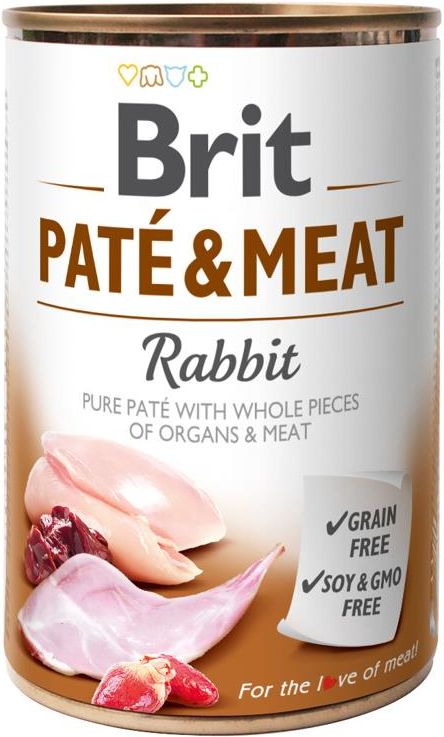 Brit Pate & Meat Rabbit PEŁNOWARTOŚCIOWA KARMA DLA PSÓW Brit Pate&Meat Rabbit zapewnia kompletne i zbilansowane żywienie. Karmę należy podawać w temperaturze pokojowej. Dawkowanie karmy może różnić się w zależności od aktywności psa i środowiska, w którym żyje. Podając puszkę celem urozmaicenia i wzbogacenia smaku posiłków, należy odpowiednio pomniejszyć dzienną porcję karmy podstawowej. Należy zapewnić psu dostęp do świeżej wody. Przechowywać w suchym i chłodnym miejscu. Po otwarciu przechowywać w lodówce. a Energia Metaboliczna 910 kcal/kg SKŁAD 44% kurczak (mięso i narządy), 26% królik (mięso  i narządy), 3% skrobia grochowa, 1% błonnik grochowy,  0,5% olej z łososia. SKŁADNIKI ANALITYCZNE białko surowe 8,0%, tłuszcz surowy 4,0%, popiół surowy 3,5%,  wilgotność 78,0%, włókno surowe 0,5%, wapń 0,1%, fosfor 0,3%, sód 0,2%. DODATKI DIETETYCZNE NA 1 KG witamina D3 (E671) 250 j.m., witamina E (3a700) 100 mg,  cynk (3b606) 15 mg, żelazo (E1) 10 mg, mangan (E5) 3 mg, jod (3b201) 0,75 mg, miedź (E4) 0,5  mg, biotyna 0,2 mg. DODATKI TECHNOLOGICZNE W 1KG  mączka chleba świętojańskiego (E410) 5 000 mg SPRAWDŹ CAŁĄ GAMĘ PRODUKTÓW BRIT PATE&MEAT Profilaktyka przez żywienie - to główna zasada, którą spełniają starannie skomponowane karmy Brit. Wiemy, że zwierzęta domowe są w równym stopniu jak my sami narażone na stres i poważne choroby, dlatego z miłości do nich opracowaliśmy unikalną recepturę, opartą na wyselekcjonowanych składnikach. Wierzymy, że odpowiednia dieta ma ogromne znaczenie dla zdrowia i kondycji naszych czworonożnych przyjaciół. Stąd w karmach Brit znajdziecie tylko to, co najlepsze: wysokiej jakości mięso, ryby, warzywa i owoce, zioła oraz składniki funkcjonalne.