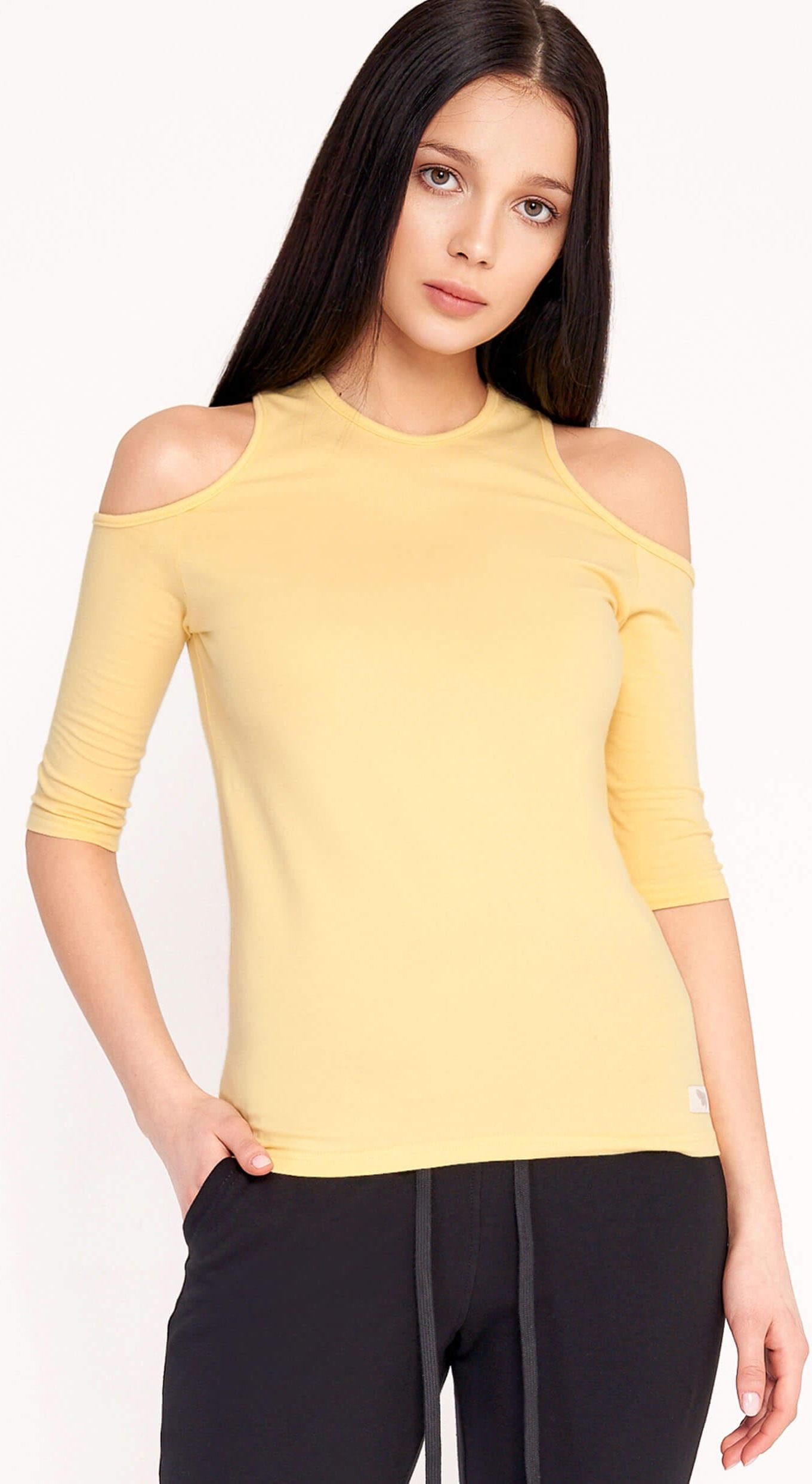 Bawełna 94%, elastan 6% Kobieca, dopasowana bluzka ze zmysłowymi, okrągłymi wycięciami na ramionach. Wąskie rękawy sięgające do łokci. Model idealny na wieczór i na specjalne okazje. Wykonany z miękkiej bawełny. Dostępna w wielu kolorach. Modelka jest wzrostu 177 cm i nosi rozmiar S. WYMIARY (w centymetrach): S: sz. w biuście 40, dł. rękawa 24, sz. na dole produktu 42, dł. całkowita 57 M: sz. w biuście 44, dl. rękawa 25, sz. na dole produktu 46, dł. całkowita 59 L: sz. w biuście 48, dl. rękawa 26, sz. na dole produktu 49, dł. całkowita 62