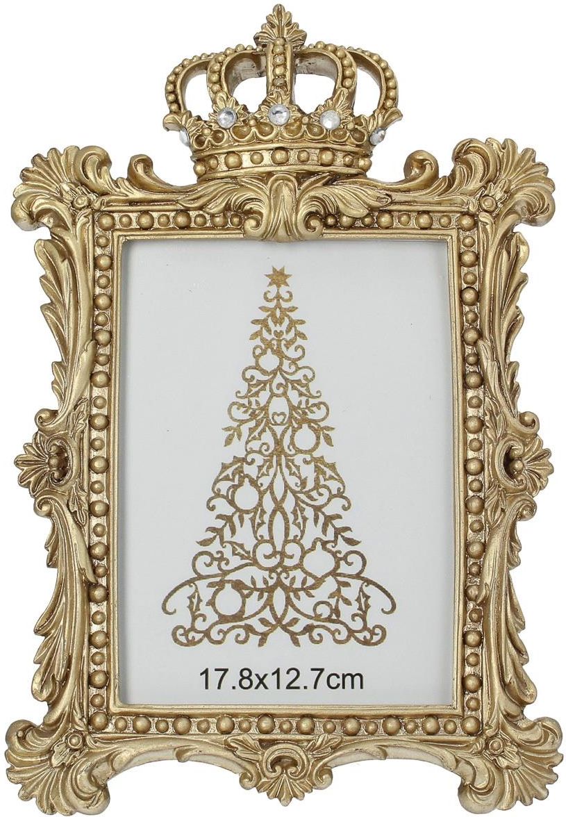 Złota ramka na zdjęcia z elegancką koroną. Lukusowa ramka Majesty z bogato zdobionymi detalami oraz elegancką koroną na górze nadaje każdemu zdjęciu królewski charakter. Idealna do eksponowania najcenniejszych wspomnień, stanowi także wyszukaną dekorację do salonu, sypialni czy gabinetu. Klasyczne ornamenty w połączeniu z subtelnym blaskiem złota doskonale komponują się z wnętrzami w stylu glamour, vintage lub klasycznym. Stwórz przestrzeń pełną wyrafinowania i wyjątkowego stylu. Tylna strona ramki wyposażona w stopkę. Ramka przeznaczona na zdjęcie o wymiarach: 15 x 20 cm.Wymiary: szer. 22 cm, gł. 2 cm, wys. 30 cm.