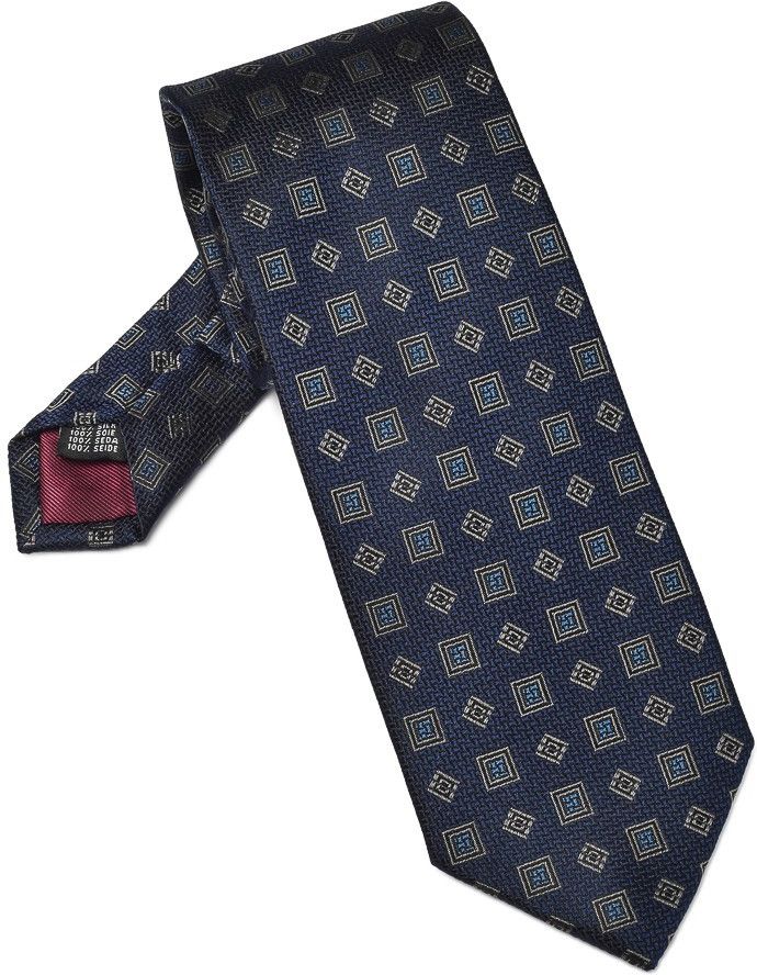 Elegancki granatowy krawat VAN THORN. Krawat wykonany jest z doskonałej jakości jedwabiu produkowanego we Włoszech. Krawat ma srebrny geometryczny wzór w kwadraty. Ten krawat będzie pasował do biznesowych i casualowych stylizacji. Krawat ma bordową podszewkę i dodatkowe wypełnienie w środku, dzięki czemu ładnie się układa i prosto się go wiąże.