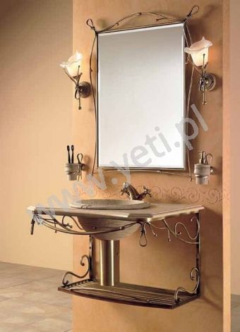 Komplet NODO umywalka z konglomeratu, blat kamień naturalny, stelaż z półką kolor brunito (stare złoto). Lustro z kinkietem NODO do kupienia oddzielnie 2500 zł.