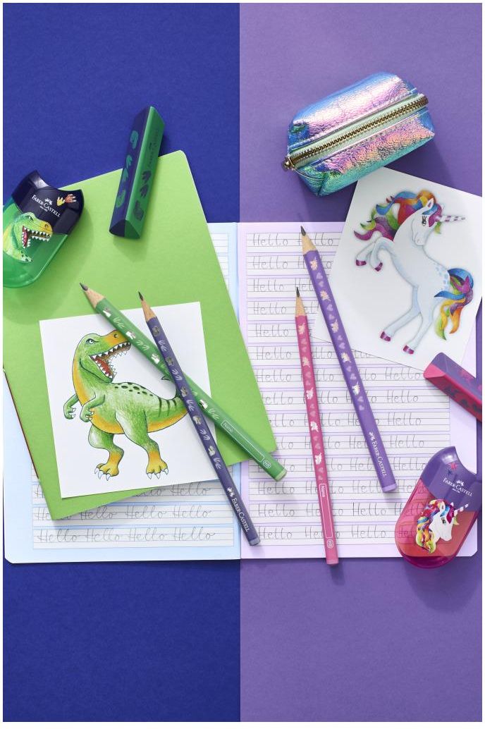 Zestaw Szkolny Dinozaury 2 x ołówek +temperówka + gumkaZestaw ołówków grafitowych Faber-Castell 2 szt. z podwójną temperówką i gumką w opakowaniu blistrowym, edycja z dinozaurem. Nawet w czasach zdominowanych przez komputery, telefony i internet, ołówek wciąż pozostaje nieodłącznym towarzyszem codzienności. To doskonałe w swojej prostocie narzędzie. Ergonomiczny trójkątny kształt zapewnia wysoki komfort użytkowania i niemęczące, wygodne pisanie i szkicowanie. Odpowiednie również dla leworęcznych. Z odpornym na pękanie grafitem, dzięki bezpiecznemu procesowi wiązania (SV). Wykonane z certyfikowanego drewna pochodzącego ze zrównoważonego i odpowiedzialnie zarządzanego leśnictwa. Powierzchnie pokryte lakierem na bazie wody – bezpiecznym dla środowiska i zdrowia dzieci. Dostępny również zestaw z edycji z jednorożcem. W zestawie 2 x ołówek +temperówka + gumka