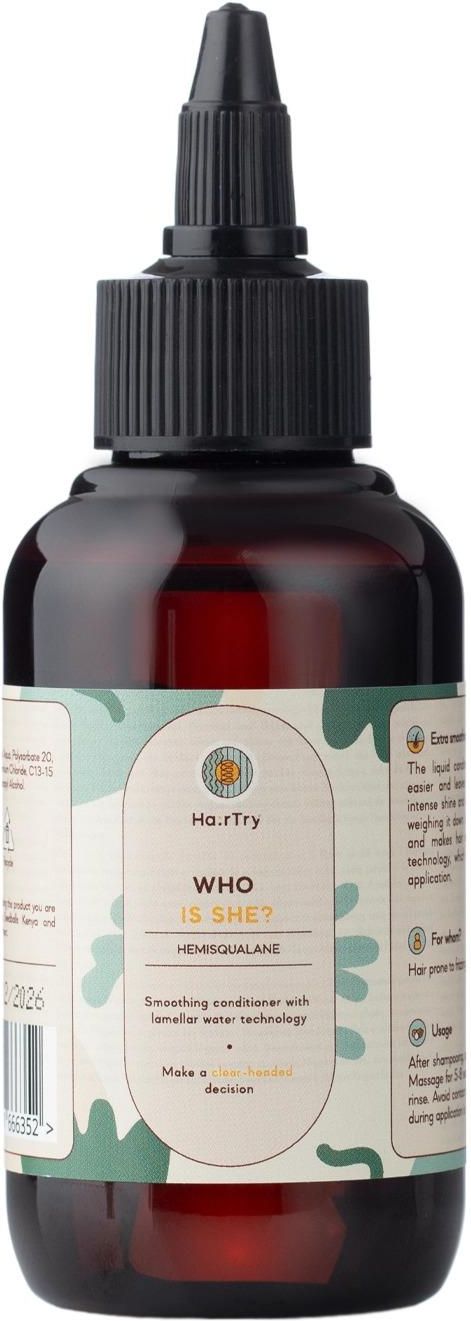HairTry - Who Is She? - odżywka do włosów z technologią wody lamelarnej. Intensywnie wygładza, dodaje blasku i wyjątkowej miękkości. Ma płynną konsystencję, która po nałożeniu na wilgotne włosy i potarciu zamienia się w lekką emulsję i wytwarza ciepło. Produkt bazuje na składnikach olejowych, dzięki czemu uzupełnia lipidy, tym samym bardzo mocno wygładzając i kondycjonując niesforne pasma. Odżywka ułatwia rozczesywanie i stylizację, przy czym nie obciąża włosów. Zapewnia efekt bankietowy, który zachwyci posiadaczy włosów matowych, szorstkich i skłonnych do plątania. Opakowanie z aplikatorem zagwarantuje wygodę stosowania.