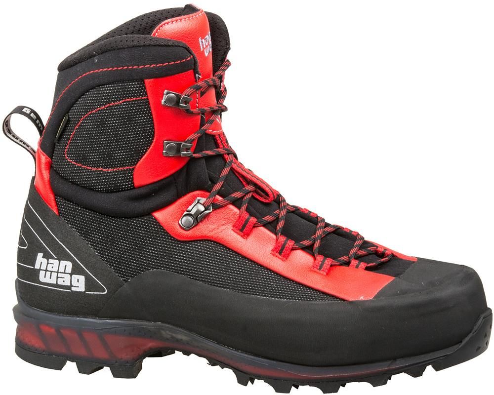 Fason: za kostkę. Kolor: Czarne, Czerwone. Rodzaj: Męskie. Sezon: na zimę. Hanwag Ferrata II GTX - przeznaczone do wspinaczki ferraty, ale ogólnie do bardziej wymagających wędrówek i łatwiejszych wspinaczek. Posiadają hybrydową konstrukcję, w której zastosowano techniczną tkaninę. Najbardziej narażone części są chronione gumą przed kopaniem i uszkodzeniami. Nadają się do skalistego i nieutwardzonego terenu, a także lodowca lub śniegu (kategoria C). Przeznaczone są do użytku z rakami półautomatycznymi. Podeszwa jest sztywna i wytrzymała, zastosowano oczywiście Vibram. Posiada segment amortyzujący pod piętą, aby zmiękczyć bieżnik.Waga Hanwag Ferrata II GTX: 1440 g (1 para 8 UK)Przeznaczenie: alpinizm, teren nieutwardzonyMateriał wierzchni: mikrofibra|syntetykMembrana: GORE-TEXPodeszwa: Vibram Integral Light, Mont CompoundWyściółka: tradycyjna stalowa/tekstylnaSystem amortyzacji Eva Shock AbsorbWnętrze: tekstylneKategoria: C Połączenie wydajności wspinaczkowej i komfortu chodzenia. Lekkie, elastyczne i kompatybilne z rakami do alpejskiej wspinaczki skałkowej, wymagających via ferrat z polami śnieżnymi i lodowymi lub letnich wycieczek alpejskich. Podeszwa środkowa TubeTec Rock zapewnia idealną równowagę między wydajnością, komfortem i trwałością. Sprawdzona mieszanka VIBRAM®-Mont i podeszwa z bieżnikiem Hanwag Integral Light do alpinizmu. Nowoczesna i funkcjonalna cholewka z technologią Hanwag LFX. Wykonane na specjalnych damskich kopytach