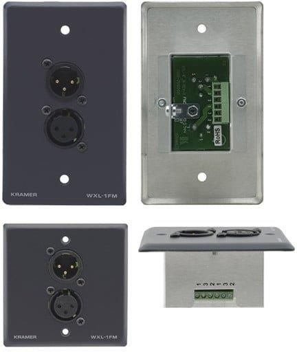 Interfejs naścienny Kramer WXL-1FM/BG(G) , który posiada żeńskie i męskie konektory XLR z przodu i listwę zaciskową z tyłu. Połączenia na panelu frontowym - XLR (F) and XLR (M). Połączenia na panelu tylnim - 6-polowe wyjście zaciskowe. Rozmiar interfejsu - wielkość pojedyńcza, typowa dla …