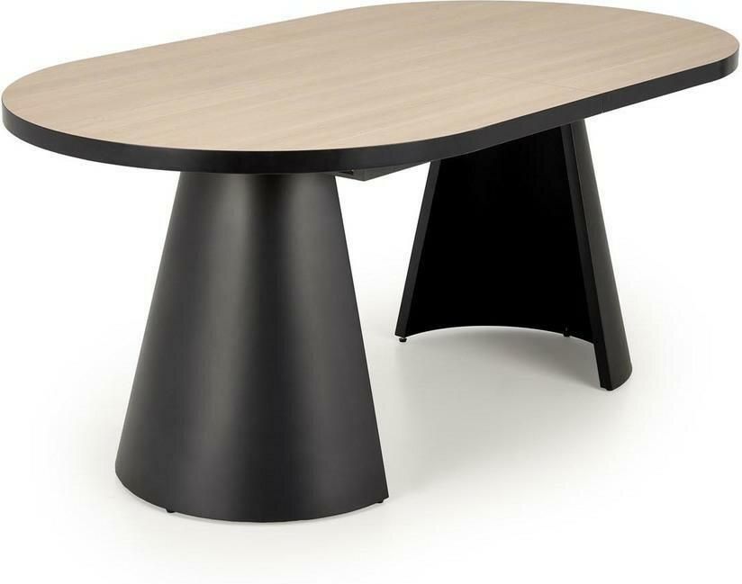 Stół rozkładany Ardel naturalny/czarny - elegancja i funkcjonalność w jednym Podkreśl wyjątkowy styl swojego wnętrza, wybierając stół rozkładany Ardel w naturalnym kolorze z czarnymi nogami. Jego nowoczesny design z subtelnym akcentem klasyki sprawi, że każde pomieszczenie nabierze wyjątkowego charakteru. Owalny kształt blatu dodaje stołowi elegancji, a możliwość roskładania sprawia, że z łatwością dostosujesz go do liczby gości lub dostępnej przestrzeni. Nowoczesny design i wysoka jakość materiałów Stół Ardel to połączenie wytrzymałej płyty MDF okleinowanej melaminą z metalową stożkowatą nogą malowaną proszkowo. Blat w naturalnym kolorze jasnego drewna z czarną krawędzią nadaje stołowi subtelności i elegancji, a czarna noga dodaje mu nowoczesnego wyrazu. Praktyczny stół Intesi do różnych pomieszczeń Stół Ardel od marki Intesi sprawdzi się zarówno w kuchni, jadalni, salonie, jak i w kawiarni czy restauracji. Jego uniwersalny design i funkcjonalność sprawiają, że jest to mebel, który z łatwością dopasuje się do każdego wnętrza. Warto wiedzieć Stół Ardel wymaga montażu, ale jest to proces prosty i szybki. Materiały, z których został wykonany, są łatwe w pielęgnacji, co znacznie ułatwia utrzymanie stołu w czystości. Produkt nie jest przeznaczony do użytku na zewnątrz. Stół rozkładany, dzięki czemu łatwo dostosujesz go do liczby gości lub dostępnej przestrzeni Nowoczesny design z subtelnym akcentem klasyki Wykonany z wysokiej jakości materiałów: płyta MDF okleinowana melaminą i stal malowana proszkowo Uniwersalny - sprawdzi się w różnych pomieszczeniach Łatwy w pielęgnacji