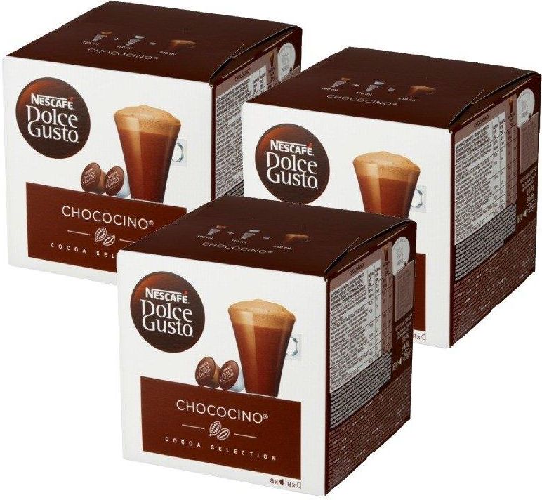 Czekolada z nutą wanilii Odkryj NESCAFÉ® Dolce Gusto® Chococino. To niezwykła gorąca czekolada z intensywną nutą wanilii z delikatną, puszystą pianką. NESCAFÉ® Dolce Gusto® Chococino przygotowuje się z dwóch kapsułek: jednej z czekoladą, a drugiej z mlekiem. Obłędnie czekoladowy smak Pyszna czekolada z dodatkiem kremowego mleka, tworzy aksamitną konsystencję, która zachwyci każdego, kto docenia smak prawdziwej czekolady. Zestaw składa się z 3 opakowań po 16 sztuk. Wartości opakowania: Liczba kapsuł: 16 Liczba napojów: 8 Waga: 256 g Pojemność napoju: 210 ml Hermetyczne zamknięcie czekolady w kapsułce gwarantuje jej wspaniały aromat i świeżość za każdym razem Pudełko zawiera 16 kapsułek (8 kapsułek z mlekiem, 8 kapsułek z czekoladą) przeznaczonych do ekspresów NESCAFÉ® Dolce Gusto®, umożliwiających przygotowanie 8 napojów Chococino.