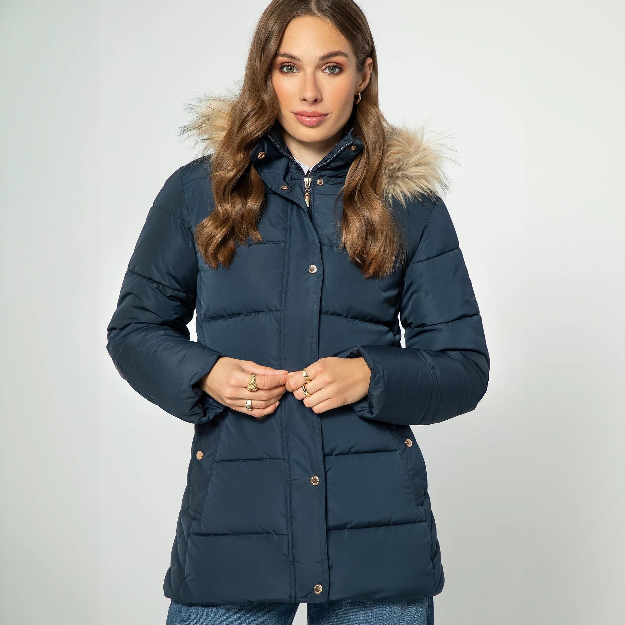Zimowa elegancja – damska kurtka z pikowaniem Przywitaj zimę z odrobiną luksusu i wyjątkowego stylu dzięki tej eleganckiej damskiej kurtce. Stworzyliśmy ją z myślą o kobietach, które pragną czuć się pewnie i modnie, niezależnie od warunków pogodowych. Dzięki starannie dobranym detalom ta kurtka z pewnością stanie się Twoim ulubionym elementem garderoby w chłodniejsze dni. Dla kogo? Stworzona dla nowoczesnych kobiet, które chcą połączyć elegancję z praktycznością. Doskonała zarówno na co dzień, jak i na specjalne okazje, zapewnia ciepło i wyjątkowy wygląd. Nasza rada: Wybierz skórzane czółenka lub botki na niewielkim obcasie, a całość dopełnij minimalistyczną torbą na laptopa, subtelną biżuterią i zegarkiem w stonowanym kolorze, aby stworzyć wygodną stylizację. Kluczowe cechy: Materiał: Poliester użyty na zewnątrz kurtki jest odporny na działanie wiatru i wilgoci, co sprawia, że jest idealnym wyborem na zimowe warunki. Podszewka: Wykonana z wysokiej jakości poliestru, podszewka zapewnia nie tylko dodatkowe ciepło, ale także komfort noszenia. Praktyczność: Odpinany kaptur jest wykończony sztucznym futerkiem, które dodaje kurtce elegancji i ciepła. Dodatkowo regulowany ściągacz pozwala dostosować kaptur do indywidualnych potrzeb, zapewniając lepszą ochronę przed wiatrem i opadami. Kieszenie: Kurtka wyposażona jest w dwie ukośne kieszenie na przodzie, które są zarówno funkcjonalne, jak i stylowe. Zapięcie: Zamek błyskawiczny w połączeniu z zatrzaskami gwarantuje pewne zamknięcie i dodatkową ochronę przed wiatrem. Detale: Pikowanie, monogram producenta na lewym ramieniu oraz sygnowane guziki, nadają kurtce charakter i unikalny styl. Odkryj, jak łatwo połączyć elegancję z funkcjonalnością – wybierz ten model kurtki i ciesz się zimą w pełnym stylu.