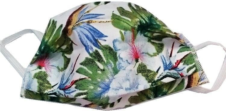 Maseczka maska ochronna na twarz dla dzieci biała listki zielone kwiaty błękitne monstery liście bawełniana 2523. Zewnętrzna warstwa wykonana z tkaniny wzorzystej o gramaturze 125 g/m2. Wewnętrzną warstwę wykonano z tkaniny białej, rzadziej tkanej. Rozmiar: 4,5 cm x 17 cm Rozmiar po rozłożeniu : 13 cm x 17 cm Przy krótszych bokach zamocowane są gumki umożliwiające odpowiednie przytrzymanie. Materiał: 100% bawełna Przepis konserwacji: -prać w temperaturze 60°C, -prasować w temperaturze do 200°C, -nie chlorować, -można suszyć delikatnie w suszarce, -nie czyścić chemicznie. Rzeczywiste kolory mogą się różnić od tych, które są prezentowane na zdjęciach.