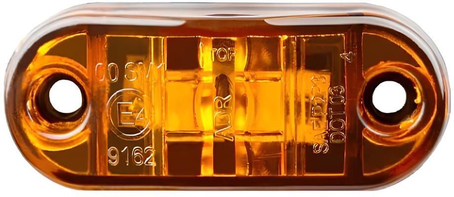 Lampka obrysowa LED samochodowaLampki w porównaniu do zwykłych żarówkowych są dużo mocniej widoczne i zużywają kilkanaście razy mniej prądu. Zasilanie od 6V do 28V DC Pobór prądu ok. 0.14W ( 11.9mA przy 12V DC) Odporność IP68 do zastosowania wewnątrz i na zewnątrz Ilość LED 2 x super Flux LED Materiał ABS Intensywność światła około 11 cd (candela) Kolor światła i klosza pomarańczowy Wymiary 65.6x27.7mm grubość 18.1mm max. Rozstaw otworów montażowych 50mm, fi 5mm (spokojnie można rozwiercić do fi 6mm) Długość przewodów około 17cm, średnica zewnętrzna 2mm, końcówki pobielone cyną Homologacja E4 (Holandia) całe UE Informacje na kloszu 00 SM1 / E4 / 9162 / ADR / SAEP2P3 DO T03 / TOP Waga 16.7g Ilość 1 sztuka Przewód żółty to +, czarny to -. Odwrotne podłączenie nie powoduje zwarcia ani uszkodzenia lampki. Lampka odwrotnie podłączona nie świeci. Główne zastosowanie to samochody dostawcze, ciężarowe oraz przyczepy. Lampki koloru pomarańczowego obrysowe stosuje się w Europie wyłącznie z boku pojazdu zgodnie ECE R48W ofercie posiadamy również inne kolory
