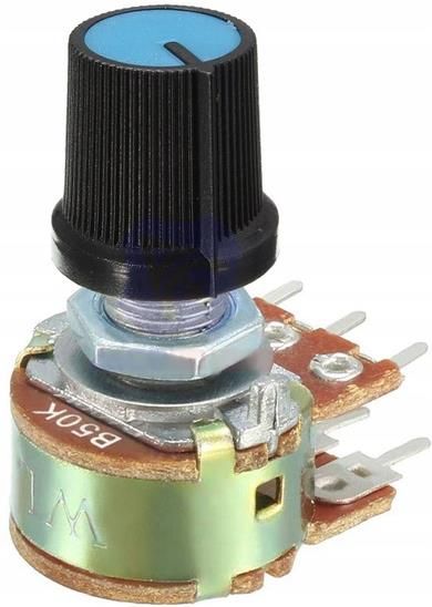 CENA DOTYCZY 1 KOMPLETU (POTENCJOMETR + GAŁKA NIEBIESKO CZARNA + PODKŁADKA NAKRĘTKA) Potencjometr 50K liniowy 2 kanały stereo Gałka niebieska nakrętka i podkładka Potencjometr można zastosować do regulacji głośności w sprzęcie audio. (źródło dźwięku - aux in) Na zdjęciu nr 2. jest schemat podłączenia potencjometru jako regulatora głośności w torze audio.