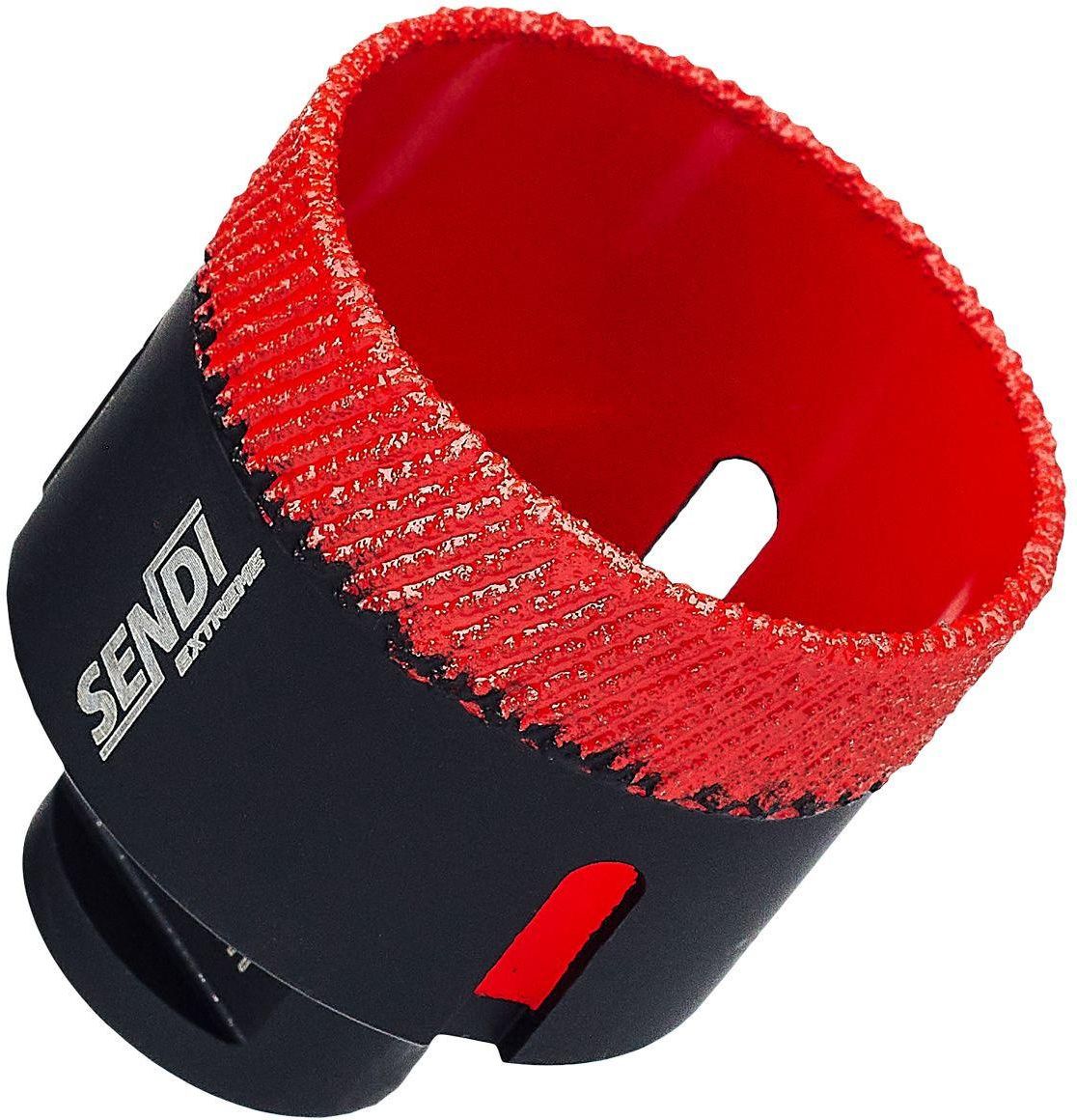 Otwornica diamentowa wiertło koronka do gresu płytek SENDI EXTREME Ø55 M14 Otwornica do płytek SENDI EXTREME Ø55x15x63xM14 Otwornica diamentowa SENDI EXTREME do szybkiego i precyzyjnego wiercenia otworów w gresie, twardym gresie, płytkach ceramicznych i kamieniu naturalnym. Specjalnie zaprojektowany turbo segment diamentowy o wysokości 15 mm, układany tylko po zewnętrznej stronie, zapewnia szybsze wiercenie, mniejsze przegrzewanie się korpusu oraz lepsze odprowadzanie urobku i ciepła, co znacząco przyspiesza pracę i zwiększa efektywność. Wiertło do płytek z mocowaniem M14 na szlifierki kątowe, do pracy głównie na sucho. Minimum trzykrotnie szybsze wiercenie z otwornicą diamentową SENDI EXTREME Ekstremalnie wysoka prędkość wiercenia Łatwe wejście w materiał minimalizuje ryzyko uszkodzenia płytek Wysoka jakość wierconych otworów Korpus wykonany z mocnej stali o wysokiej jakości Technologia lutowania próżniowego z innowacyjnym ułożeniem segmentu diamentowego W celu wykonania precyzyjnego otworu wystarczy zmniejszyć nacisk. Choć proces wiercenia będzie trwał nieco dłużej, ilość odprysków zostanie zmniejszona, co zwiększy dokładność wykonanych otworów. Rzeczywista żywotność otwornicy zależy od jej użytkowania, rodzaju materiału, jego grubości oraz twardości. Parametry techniczne Średnica: 55 mm Mocowanie: M14 Wysokość diamentu: 15 mm Długość robocza: 40 mm Długość całkowita: 63 mm Chłodzenie: Na sucho Max. prędkość obrotowa: 12 000 obr./min