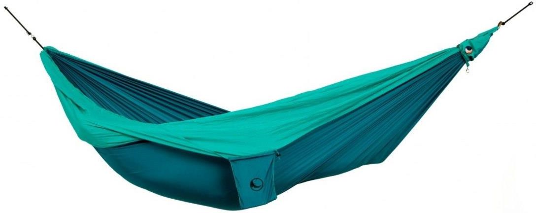 Hamak podwójny navy emerald(36)/green(11) (0727670920703)- to lekki, szybkoschnący i odporny na plamy dwuosobowy hamak turystyczny. Testowany w każdym klimacie i charakteryzujący się nowoczesnym design’em. Produkt został wykonany z najwyższej jakości nylonu. Hamak jest przyjazny dla skóry, elastyczny, oddychający i trwały, a także odporny na zawilgocenia i utratę koloru. Dobrze chroni przed wiatrem i insektami, dzięki czemu zapewnia komfortowy wypoczynek w terenie. Ticket to the moon to nietuzinkowy producent hamaków kempingowych, którego siedziba, od 1996 roku znajduje się na Bali. Firma tworzy innowacyjne i użyteczne produkty, a także promuje różne style życia. Najważniejsze cechy: obciążenie maksymalne: 200 kg lekki i wytrzymały odporny na plamy 100% nylon