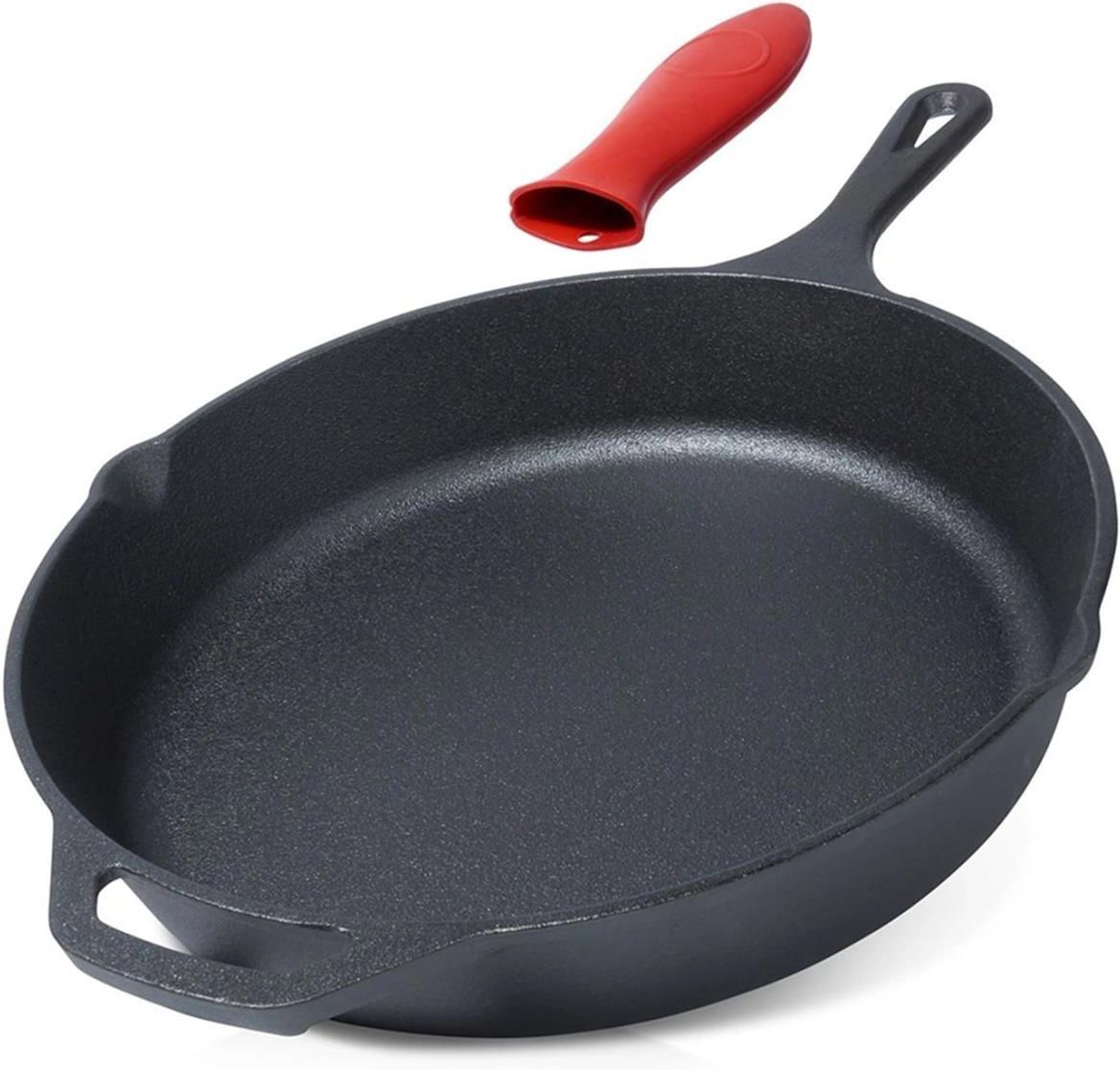 Patelnia żeliwna o średnicy 30 cm w zestawie z ochronną nakładką silikonową na rączkę patelni. Można stosować ją na indukcji, w piekarnikach, na piecu i bezpośrednio na grillu. Czarna powierzchnia została uzyskana dzięki unikatowemu procesowi wypalania żeliwa w oleju roślinnym w bardzo wysokiej temperaturze. Powierzchnia została dodatkowo oksydowana co zmniejsza podatność na rdzewienie. Zaleca się jednak okresowe smarowanie całej powierzchni cienką warstwą oleju jadalnego aby nie dopuścić do pojawienia się rdzy. NIEZAWODNA - Wielofunkcyjna patelnia żeliwna o średnicy 30 cm w zestawie z nakładką na rączkę. Wymiary zewnętrzne: długość 48,5 cm, szerokość 32 cm, wysokość patelni 6 cm, wysokość z rączką 6 cm. Pozwoli przygotować pyszne dania z mięsa, warzyw, ziemniaków. ŻELIWNA - Patelnia wykonana w całości z odlewu żeliwa w kolorze czarnym. Naczynia wykonane z żeliwa idealnie rozprowadzają ciepło oraz długo utrzymują wysoką temperaturę. Naczynie jest solidne, masywne, długowieczne. Odpowiednio konserwowana - natłuszczana, posłuży przez wiele lat. ODPORNA - Patelnia odporna na wysokie temperatury. Naczynie idealne do smażenia oraz pieczenia. Posiłki można przygotowywać na piecu, bezpośrednio na ogniu a także w piekarniku. Nie zaleca się mycia w zmywarce do naczyń. UWAGA! Po każdym użyciu umyć, wytrzeć suchą szmatką do sucha i natłuścić. NAKŁADKA SILIKONOWA - Wyposażona w wygodny uchwyt ułatwiający przenoszenie oraz dwie wylewki, które ułatwią nakładanie przygotowanych potraw. Dodatkowo w zestawie nakładka silikonowa w kolorze czerwonym do założenia na rączkę patelni, która zapewni bezpieczne przenoszenie bez obaw o poparzenie. Nakładkę wystarczy nałożyć na rączkę patelni. Rączka posiada otwór, który pozwoli nam na zawieszenie patelni np. na relingu kuchennym. UNIWERSALNA - Patelnia idealnie nadaje się do smażenia, duszenia, pieczenia i przygotowywania wszelkiego rodzaju dań czy przekąsek. Sprawdzi się do przyrządzenia pysznego i aromatycznego jedzenia w każdej kuchni, na kempingu czy podczas grillowania. Patelnie wykorzystamy również do bezpośredniego serwowania dań np. pieczonych ziemniaczków. Nadaje się na kuchnie gazowe, elektryczne, ceramiczne, halogenowe oraz indukcję. Okrągła patelnia żeliwna idealna do przygotowywania różnego rodzaju potraw. Patelnia zapewnia szybkie i jednolite smażenie. Możemy użytkować ją w każdej kuchence, ale również bezpośrednio na grillu, czy ogniu. Patelnia jest niezwykle solidna i ciężka. Żeliwo rozgrzewa się równomiernie i długo utrzymuje ciepło, dzięki czemu serwowane dania dłużej będą ciepłe. W zestawie nakładka na rączkę patelni. Sprawdzi się w domu, a także podczas biwaków, wycieczek pod namiot czy innych wyjazdów. Oryginalny produkt marki Vilde z linii Cast Line. Wyprodukowano zgodnie z europejskimi standardami. Produkty żeliwne nie są przystosowane do mycia w zmywarkach. Należy je myć ręcznie i następnie wytrzeć do sucha aby uniknąć pojawiania się rdzy.