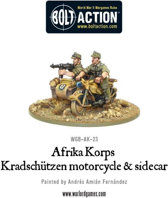 Zestaw proponowany przez firmę WARLORD GAMES zawiera model do sklejania i samodzielnego pomalowania w skali 1:56 (28mm). Oferowany model nadaje się do gry bitewnej BOLT ACTION. Kluczem do kampanii prowadzonej na Pustyni Zachodniej była mobilność, niezbędna do przemierzania rozległych, piaszczystych pustyń. W rezultacie obie strony w dużym stopniu polegały na czołgach i środkach transportu. Wśród nich znalazły się motocykle BMW 75 i Zundapp, wykorzystywane przez Deutsche Afrika Korps, które zwiększały prędkość i zwrotność sił Afrika Korps. Kierowcy są oddzieleni od motocykla, dzięki czemu można ich łatwo dopasowywać według własnych preferencji. Na przykład, można dodać pasażera do tylnej części zestawu motocykla z wózkiem bocznym. Modele te wykorzystują również nasz system figurek, dzięki czemu można wybrać, z którymi głowami je zbudować, a także zapewnić sobie swobodę ich ustawienia. Zestaw zawiera 1 metalowy motocykl i wózek boczny oraz 2 metalowe figurki.