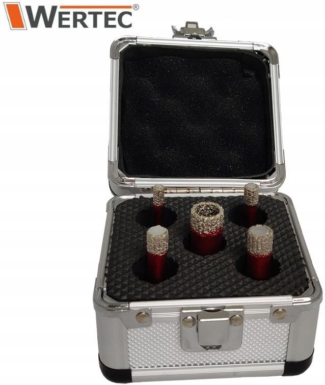 Przedmiotem sprzedaży jest zestaw koronek diamentowych 6-12mm Wertec WTAS05A Koronki marki Wertec są innowacyjnym rozwiązaniem do szybkiego wiercenia twardych płytek, gresu, wszędzie tam, gdzie nie radzą sobie dotychczas dostępne otwornice. Dzięki nowej technologii próżniowego lutowania diament mocowany jest w temperaturze powyżej 1000 stopni Celsjusza, co znacząco zwiększa trwałość i zarazem szybkość wiercenia. Wykonane są ze stali o wysokiej wytrzymałości, prędkość robocza wynosi od 10 000 do 14 000 obr/min. Końcówka zakończona gwintem M14 umożliwia zamontowanie na powszechnie dostępnych szlifierkach kątowych. Koronki diamentowe Wertec to nieodzowne narzędzie dla każdego nowoczesnego glazurnika. Zestaw zawiera koronki diamentowe LIMITED EDITION o rozmiarach: 6mmx 1 szt. , 8mmx 1 szt. , 10mmx 1 szt, 12mmx 1 szt 16mm x 1 szt