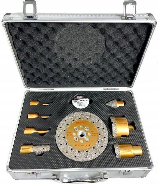 Zestaw zawiera: Koronka ø 6mm 1 szt Koronka ø 8mm 1 szt Koronka ø 10mm 1 szt Koronka ø 35mm 1 szt Koronka ø 65mm 1 szt Frez diamentowy stożkowy M14 2-38mm 1 szt Frez diamentowy palcowy ø20mm 1 szt Wosk chłodzący do otwornic 50ml 1 szt Tarcza do cięcia i szlifowania 125x2xM14 1 szt Koronki marki …