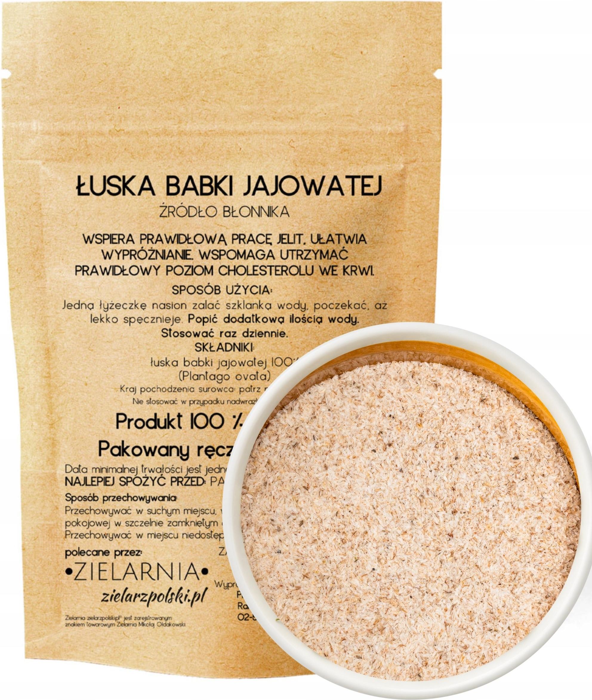 Babka jajowata łuska 100g zielarzpolski Dlaczego warto wybrać łuskę babki jajowatej od zielarzpolski? Surowiec wysokiej jakości. Produkt 100 % naturalny. Pakowane ręcznie w Polsce Praktyczne i bezpieczne opakowanie z wielokrotnym zamknięciem strunowym. Łuska babki jajowatej są źródłem BŁONNIKA, nie …