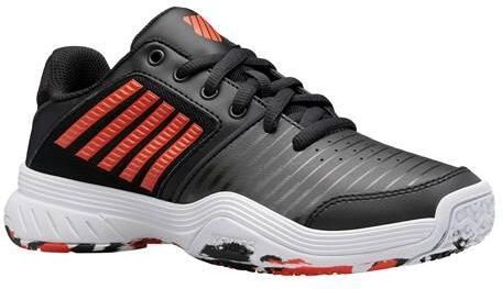 K-Swiss Court Express Omni Junior - dziecięce buty stworzone z myślą o młodych tenisistach. Ten model wyposażony został w podeszwę Omni, która jest odpowiednia na różne nawierzchnie kortów tenisowych, w tym trawę. Cholewa butów wykonana z nowoczesnych tworzyw co sprawia, że jest wyjątkowo komfortowy i wytrzymały. Wierzchnia część butów posiada system wentylacji. Miękka wkładka dobrze dopasowuje się do kształtu dziecięcej stopy zapewniając odpowiednią amortyzację i komfort. Wytrzymała podeszwa zewnętrzna zapewnia przyczepność i bezpieczeństwo w trakcie gry. AÖSTA II RUBBER COMPOUND - podeszwa zewnętrzna o wysokiej gęstości zapewnia niezrównaną trwałość od pięty do palców K-EVA - specjalna formuła pianki EVA zapewniająca maksymalną amortyzację i zwiększającą trwałość podeszwy środkowej, Kolor: Jet Black/White/Spicy Orange Marble (za producentem).
