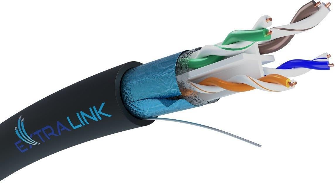Kabel sieciowy FTP Cat.6. Opakowanie zawierające 25m kabla. Kabel sieciowy najczęściej stosowany do budowy sieci lokalnych. Kategoria 6 obejmuje okablowanie, którego wymagania pasma są do częstotliwości 250 MHZ (przepustowość rzędu 200 Mb/s).Przewiduje ono implementację Gigabit Ethernetu (4x 250MHz =1GHZ) i transmisji ATM 622 Mb/s . Zbudowany jest z 4 par kabli skręconych ze sobą w celu eliminacji zakłóceń elektromagnetycznych oraz wzajemnych. Przewody wykonane są z czystej miedzi o grubości 23 AWG oraz są otoczone powłoką PE o średnicy 1,08 mm. Zewnętrzna powłoka PE jest grubości 0,60mm. Najważniejsze cechy Kabel UTP kategorii 6 Długość 25 m Powłoka PE Płaszcz zewnętrzny PE o grubości 0,6 mm Produkt przeznaczony do użytku na zewnątrz Powłoka PE oraz wygodne rozwijanie podczas montażu Powłoka z polietylenu PE ma wysoką wytrzymałość mechaniczną, wysoką odporność chemiczną i barierowość w stosunku do gazów co pozwala na użycie kabla na zewnątrz budynku. Opakowanie wyposażone w samo rozwijającą się rolkę pozwala na wygodne rozwijanie kabla bez jego niebezpiecznego poplątania Skrętka Extralink do użytku zewnętrznego Kabel Extralink CAT6 FTP (F/UTP) V2 przeznaczony jest do użytku na zewnątrz, posiada wysoką odporność na warunki atmosferyczne. Skrętka często wykorzystywana jest także w instalacjach telewizji przemysłowej, gdzie jednym kablem można przesłać sygnał wizji z kilku kamer i zasilanie.