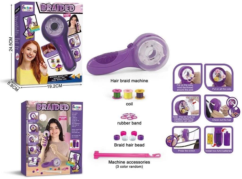 ZESTAW DO OZDABIANIA WŁOSÓW Zestaw do stylizacji włosów składa się z maszynki oraz gumek, idealny prezent dla każdej dziewczynki. Dzięki maszynce możemy zakręcić kolorowe nitki wokół włosów i stworzyć niesamowite kolorowe pasemka ozdabiając je dodatkowo gumkami. ZAWAROŚĆ ZESTAWU Maszynka 3 kolorowe nitki gumki do włosów zapinki SPECYFIKACJA Długość maszynki ok.: 17,5 cm Wymiary opakowania ok.: 19,5 x 6 x 24 cm Zasilanie: 2 baterie AAA 1,5V (nie dołączono) Sugerowany wiek: 6 lat+ UWAGA Zestaw może nieznacznie różnić się od przedstawionych na zdjęciach. OSTRZEŻENIE Nieodpowiednie dla dzieci w wieku poniżej 3 lat. Ryzyko połknięcia lub przedostania się do gónych dróg oddechowych, małych elementów. Unikać kontaktu zabawki lub jej elementów z górnymi drogami oddechowymi.