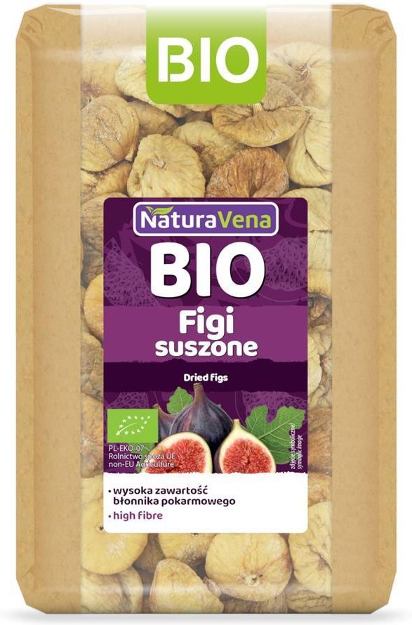 SKŁADNIKI ekologiczne figi suszone 100 %. OPIS Ekologiczne figi mogą stanowić doskonałą przekąskę zarówno dla dzieci, jak i dla dorosłych. Świetnie nadają się do dosładzania dżemów owocowych. Polecamy jako dodatek do porannej owsianki, ciast, deserów. Na suszonych figach może występować biały nalot. Jest to zjawisko naturalne, związane z wytrącaniem się fruktozy, które nie wpływa na jakość produktu. WARTOŚĆ ODŻYWCZA W 100 g Wartość energetyczna 1269 kJ/301 kcal Tłuszcz 2,1 g w tym kwasy tłuszczowe nasycone 0 g Węglowodany 61 g w tym cukry 37 g Błonnik 14 g Białko 2,5 g Sól 0,12 g ZALECANE WARUNKI PRZECHOWYWANIA Przechowywać w suchym i chłodnym miejscu. BEZ CUKRU (w składnikach): BEZ CUKRU (w składnikach) BEZ GLUTENU (w składnikach): TAK Certyfikat bio: CERTYFIKAT BIO EAN: 5906750251547 Gwarantowany termin przydatności (w dniach): 60 Kraj pochodzenia składników: Turcja Orientacyjny termin przydatności: 31.07.2026 PRODUCENT / DYSTRYBUTOR – NAZWA I ADRES: BIO PLANET S.A., WILKOWA WIEŚ 7, 05-084 LESZNO Wegański: TAK Wegetariański: TAK