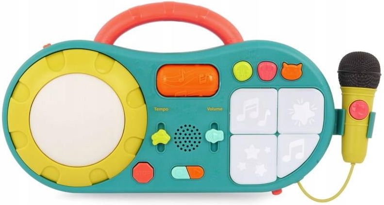 Interaktywna zabawka MiniMixer - konsola muzyczna DJ-a do miksowania muzyki, B.Toys Pierwsza konsola miksująca muzyką dla małego DJ-a z wejściem na słuchawki od marki B.Toys. Istny urodzaj funkcji, m.in. odtwarzanie muzyki w różnych trybach, remiksowanie, skreczowanie, a nawet bity perkusyjne. Nagrywanie. Regulacja głośności i tempa. Prawie 30 piosenek i rozmaitych odgłosów. Efekty świetlne. Mikrofon. Zabawka muzyczna, która wspomaga samoekspresję i kreatywność, a także pozwala budować pewność siebie. Rozwija przy tym koordynację oko-ręka, pamięć i koncentrację. Prawdziwa obfitość muzycznych eksperymentów do przeprowadzenia! Przygoda zaczyna się od wyboru odpowiedniego klimatu: klasyka rytmy techno a może przyjazne, zabawne miauknięcia? Zdecyduj, a potem przejmij kontrolę! Zakręć talerzem, aby zeskreczować / zescratchować płytę jak profesjonalny DJ. Mikrofon pozwala dodać wokal. Możesz również nałożyć własny rytm, korzystając z podświetlanego padu bębnowego lub dodać 12 zabawnych dźwięków za pomocą przycisków SFX – efekty specjalne (!). Nie zapomnij nagrać remiksu, żeby go potem zaprezentować lub odsłuchać! Zabawka wyposażona w: Przełącznik ON/OFF – włączanie/wyłączanie.Nieużywana konsola wyłącza się automatycznie po 2 minutach, by oszczędzać energię. Pad perkusyjny – efekty świetlne i 4 dźwięki perkusji. Obrotowy dysk/krążek – daje efekty skreczowania, imitując charakterystyczne dźwięki, które DJ uzyskuje poruszając płytą winylową w tył i w przód. Muzyczny cylinder – naciśnięcie skutkuje odtwarzaniem jednej z 9 wgranych piosenek; aby przełączyć na kolejną, wystarczy obrócić cylinder. Przyciski wyboru muzyki – TECHNO, KLASYKA i MOTYWY “MIAU, MIAU.” Mikrofon – wciągany automatycznie na swoje miejsce (wystarczy nadusić przycisk), z praktycznym mocowaniem/obejmą. Gniazdo słuchawkowe – umożliwia podłączenie słuchawek z wtyczką 3,5mm (słuchawki NIE są zawarte w zestawie). Przycisk STOP – do natychmiastowego uciszenia zabawki i wyłączenia wszystkich efektów świetlnych. Suwak Tempo – regulacja tempa. Nagrywanie – głosu i muzyki. Przycisk odsłuchiwania własnych nagrań. Suwak Volume – regulacja głośności. Przyciski z EFEKTAMI SPECJALNYMI – dodatkowe efekty dźwiękowe, zależne od wybranego trybu muzycznego. Wygodny uchwyt – zapewnia wygodę przenoszenia – na wypadek, gdyby trudno było się z konsolą rozstać, a nawet chciało ją zabrać w podróż. Rodzice docenią przycisk stop, regulację głośności, a przede wszystkim najważniejszą funkcję: wejście na słuchawki, dzięki czemu zabawa może trwać w ciszy! Stanowi to również idealną opcję do zabawy w samochodzie, pociągu czy samolocie. Nagrody i wyróżnienia: 2024 Toy Insider Spring & Summer Gift Guide (2024). Zabawka zalecana dla dzieci w wieku od 3 lat. Przypadnie do gustu również starszym dzieciom. Zgodna z europejskimi, kanadyjskimi i amerykańskimi normami bezpieczeństwa zabawek, w tym regulacjami w zakresie ftalanów i BPA. Wmontowane 3 baterie AAA (1.5V). Kolory i szczegóły mogą się różnić względem widocznych na zdjęciach. Zestaw NIE zawiera słuchawek widocznych na zdjęciach. Wiek: 3+ Nie zawiera FTALANÓW ani BPA (Bisfenolu A). Wymiary: zapakowana zabawka ok. 31 x 18,5 x 9 cm