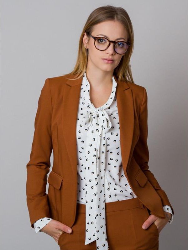 Marynarka damska Willsoor Wybierając elegancką, jednorzędową marynarkę damską marki Willsoor bez wątpienia przekonasz się do noszenia jej nie tylko od święta, ale również na co dzień! Marynarka jest lekka i wygodna, dzięki czemu nawet nie poczujesz, że masz na sobie tak niebywale elegancki strój. Została uszyta z wysokiej jakości materiału o gładkiej fakturze. Materiał jest elastyczny i delikatny w dotyku. Krój wyraźnie podkreśla linię talii. Guziki oraz kieszenie z patkami stylowo uzupełniają nowoczesny design marynarki. Tkanina: 57% wiskoza, 40% poliester, 3% elastan Kolor główny: brązowy (cynamonowy) Producent: Willsoor Gwarancja: 24 m-ce