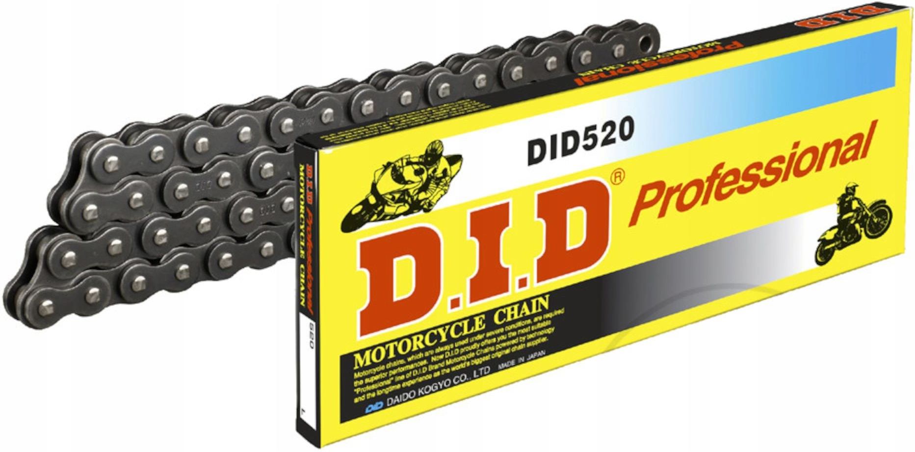 Nowy łańcuch napędowy renomowanej firmy DID Parametry produktu: Gwarancja: 12 mies., Rozmiar: 520, Model: bezoringowy, Ilość ogniw: 94, Rodzaj uszczelnienia: bezoringowy, Szerokość rolki [mm]: 6,35, Grubość płytki wew. [mm]: 2, Grubość płytki zew. [mm]: 2, Długość trzpienia [mm]: 17,5, Maks. obciążenie [kg]: 3170, Kolor: czarny, Ukryta cecha: DID111, Długość ogniwa [mm]: 15,875. Opis ogólny: typ: Standard - podstawowy model marki DID, bez o-ringowy dostosowany do starszych typów motocykli, nie zaleca się używania tego łańcucha w nowszych motocyklach o dużej mocy, dedykowany do motocykli o maksymalnej pojemności do 250 cc, towar produkcji japońskiej, łańcuch otwarty, zapinka w zestawie. Cena dotyczy jednej sztuki. 16083-32860