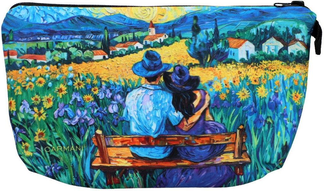 Ta duża kosmetyczka marki Carmani to połączenie elegancji, funkcjonalności i sztuki. Na jej powierzchni znajduje się urzekający motyw inspirowany twórczością Vincenta Van Gogha – obraz przedstawiający parę ludzi siedzących na ławeczce wśród pól pełnych irysów oraz słoneczników. Został on wykonany w …