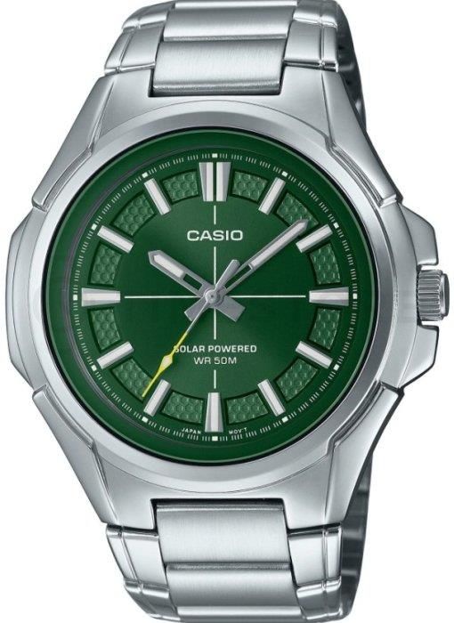 OPIS Zegarek męski Casio MTP-RS100D-3A to klasyczna propozycja dla mężczyzn, którzy szukają eleganckiego, ale i funkcjonalnego dodatku do swojej codziennej garderoby. Jego ponadczasowy design i solidne wykonanie sprawiają, że doskonale komponuje się zarówno z casualowymi, jak i bardziej formalnymi stylizacjami. Zegarek ten to kwintesencja prostoty i elegancji, które sprawdzają się w każdej sytuacji. Tarcza zegarka w odcieniu zieleni przyciąga wzrok subtelnym połyskiem, tworząc elegancki kontrast z jasnymi, wyraźnymi indeksami oraz wskazówkami, które zapewniają łatwy i szybki odczyt godziny. Dzięki starannie zaprojektowanej powierzchni, tarcza prezentuje się bardzo schludnie i nowocześnie, a jej minimalizm dodaje zegarkowi szyku. Chroniące ją szkło mineralne jest odporne na zarysowania, dzięki czemu zegarek będzie wyglądał jak nowy przez długi czas. Obudowa zegarka Casio MTP-RS100D-3A została wykonana z wysokiej jakości stali nierdzewnej, co zapewnia nie tylko estetyczny wygląd, ale także trwałość i odporność na codzienne uszkodzenia. Zegarek wyposażony jest w klasyczny stalową bransoletę, która idealnie dopełnia całość. Dzięki precyzyjnie wykonanemu wykończeniu, pasek dobrze układa się na nadgarstku, oferując wygodę i komfort noszenia przez cały dzień. Casio MTP-RS100D-3A to także model, który cechuje się wodoszczelnością do 50 metrów, co sprawia, że zegarek jest odporny na drobne zachlapania, jak deszcz czy mycie rąk. To praktyczna funkcjonalność, która zapewnia wygodę użytkowania w codziennych warunkach, bez obaw o uszkodzenie zegarka. Zegarek Casio MTP-RS100D-3A to idealna propozycja dla mężczyzn, którzy cenią klasyczny styl, wysoką jakość wykonania i niezawodność w jednym. Jego elegancki wygląd oraz solidna konstrukcja sprawiają, że jest to model, który będzie towarzyszył Ci przez długie lata, dodając szyku i charakteru każdej stylizacji. To zegarek, który łączy prostotę z funkcjonalnością, doskonale wpisując się w potrzeby współczesnego mężczyzny. SPECYFIKACJA Mechanizm solarny Koperta i bransoleta ze stali szlachetnej Szkło: mineralne FUNKCJE Wodoszczelność: W50 WYMIARY szerokość koperty: 50 mm grubość koperty: 10 mm szerokość bransolety: 20 mm maksymalny obwód: ok. 20 cm KOLORYSTYKA tarcza: zielona bransoleta: srebrna koperta: srebrna W komplecie pudełko ozdobne Casio