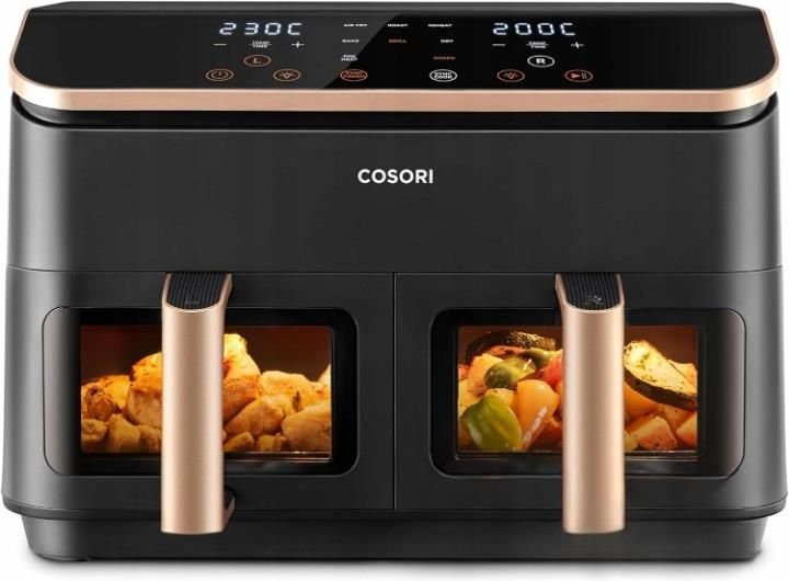 Cosori Frytkownica na gorące powietrze 6w1 2 komory Dual Zone Air Fryer XXL, 8,5l energooszczędna Towar nowy, fabrycznie zapakowany. KOLOR: CZARNO-ZŁOTY Zdrowe gotowanie w nowoczesnym stylu! Odkryj innowacyjną frytkownicę beztłuszczową COSORI CAF-R903-AEU, która pozwala na szybkie i wygodne przygotowanie pełnych posiłków. Dzięki dwóm niezależnym komorom o łącznej pojemności 8,5 litra, możesz jednocześnie przygotować różne dania, oszczędzając czas i energię. Stylowe złote wykończenie oraz nowoczesny design sprawią, że urządzenie stanie się ozdobą każdej kuchni. Najważniejsze cechy ✅ Dwie niezależne komory ✅ Technologia Dual Zone ✅ Beztłuszczowe smażenie ✅ Duża pojemność 8,5 L ✅ 6 funkcji gotowania ✅ Przezroczyste okienka ✅ Intuicyjny panel dotykowy ✅ Energooszczędność ✅ 50 gotowych przepisów Dwie niezależne komory – możliwość gotowania dwóch potraw jednocześnie w różnych temperaturach i czasach. Technologia Dual Zone – synchronizacja gotowania, aby obie potrawy były gotowe w tym samym czasie. Beztłuszczowe smażenie – chrupiące i zdrowe potrawy dzięki technologii gorącego powietrza. Duża pojemność 8,5 L – idealna dla rodzin i większych porcji. 6 funkcji gotowania – smażenie na gorące powietrze, pieczenie, grillowanie, podgrzewanie, odgrzewanie i suszenie. Przezroczyste okienka – monitorowanie procesu gotowania bez konieczności otwierania koszy. Intuicyjny panel dotykowy – wygodne ustawienia temperatury i czasu gotowania. Energooszczędność – zużywa mniej energii w porównaniu do tradycyjnych piekarników. 50 gotowych przepisów – inspiracje kulinarne dostępne w zestawie. Frytkownica COSORI Dual Zone Air Fryer XXL wyposażona jest w technologię Rapid Air, która umożliwia równomierne rozprowadzanie gorącego powietrza, zapewniając chrupiące rezultaty bez konieczności użycia dużej ilości oleju. Dodatkowo funkcja SYNC pozwala zsynchronizować różne ustawienia obu komór, dzięki czemu cała potrawa będzie gotowa w tym samym momencie. Łatwość obsługi i czyszczenia Wyjmowane kosze z nieprzywierającą powłoką – łatwe do mycia, również w zmywarce. Funkcja automatycznego wyłączania – bezpieczne użytkowanie. Regulacja temperatury od 35°C do 230°C – idealne do różnych potraw. Dlaczego warto wybrać COSORI CAF-R903-AEU? Gotowanie dwóch różnych potraw jednocześnie – oszczędność czasu! Zdrowe i smaczne posiłki bez zbędnego tłuszczu. Łatwe czyszczenie i obsługa – idealna dla każdego użytkownika. Nowoczesny design i eleganckie złote wykończenie. Zamów już dziś i ciesz się zdrowymi, pysznymi posiłkami przygotowanymi w mgnieniu oka! Dane techniczne Model: COSORI CAF-R903-AEU Pojemność: 8,5 L (2 komory po 4,25 L każda) Moc: 1700 W Temperatura: 35°C – 230°C Wymiary: 42,2 x 45,3 x 31,7 cm Kolor: Złoty Zasilanie: 220-240V